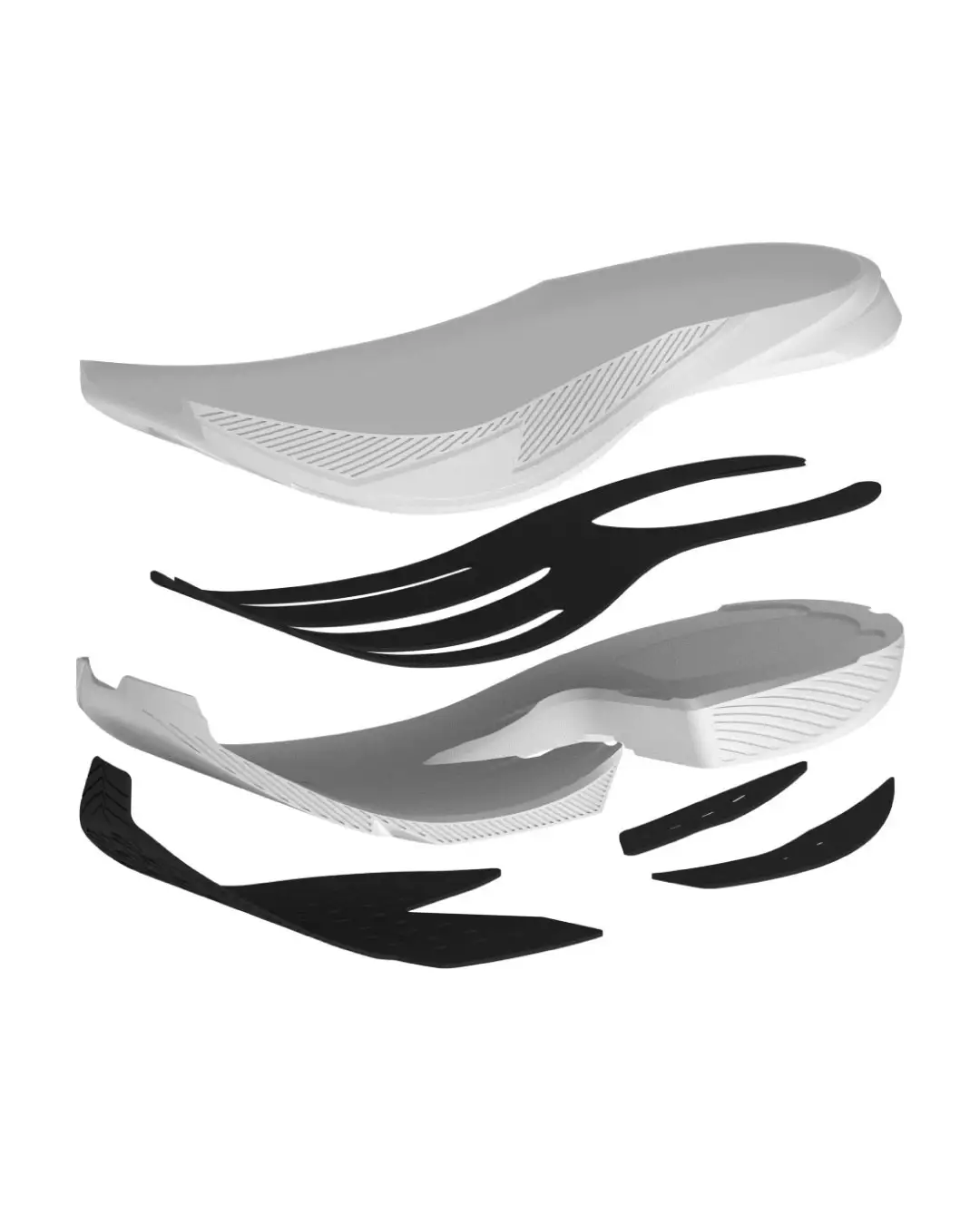 前足部にかけて4本に分かれるフォーク型の形状によって、どの位置で着地をしても反発力と推進力を受けやすい構造になっています。また、前足部では人差し指部分のプレートの面積を広く確保することにより、蹴りだしの際に一番圧がかかるポイントへ効率的に力が伝わりやすくしています。後足部にかけて翼のように分かれている部分はヒール接地時の安定性を考慮し、中足部の裏の部分も厚くすることにより着地時にブレが起きにくいように設計されています。