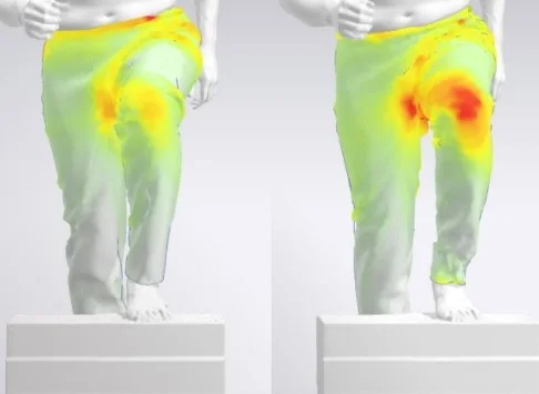 「6Dパターン」を採用したアイテム(左)では、膝付近のストレスが軽減 ※赤が濃いほどストレスが大きい