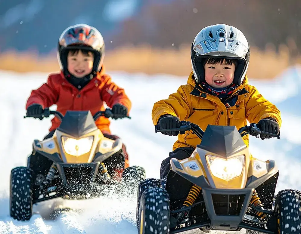 誰でも簡単に運転できて、7歳以上のお子様から、1人で乗れるサイズです。雪道を走る爽快感を感じてください。