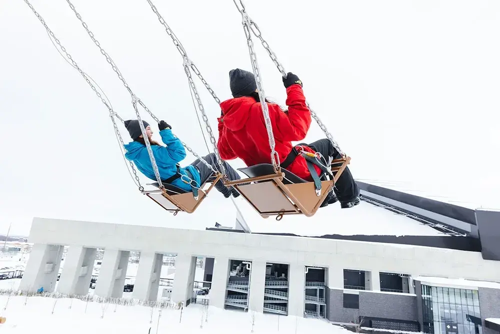 高さ8mのデッキから大型ブランコに乗って空へ駆け上がる爽快感が味わえるFビレッジの人気アクティビティは、冬期間も営業します。冬の北海道の雄大な景色と、この時期だけの雪化粧したエスコンフィールドをお楽しみください。