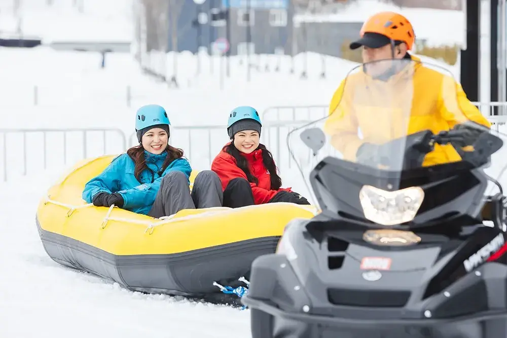 スノーモービルが牽引するラフティングボートに乗り込んで雪上を疾走する「スノーラフティング」。 スリルとワクワクを求めたい方にオススメの定番アクティビティです。