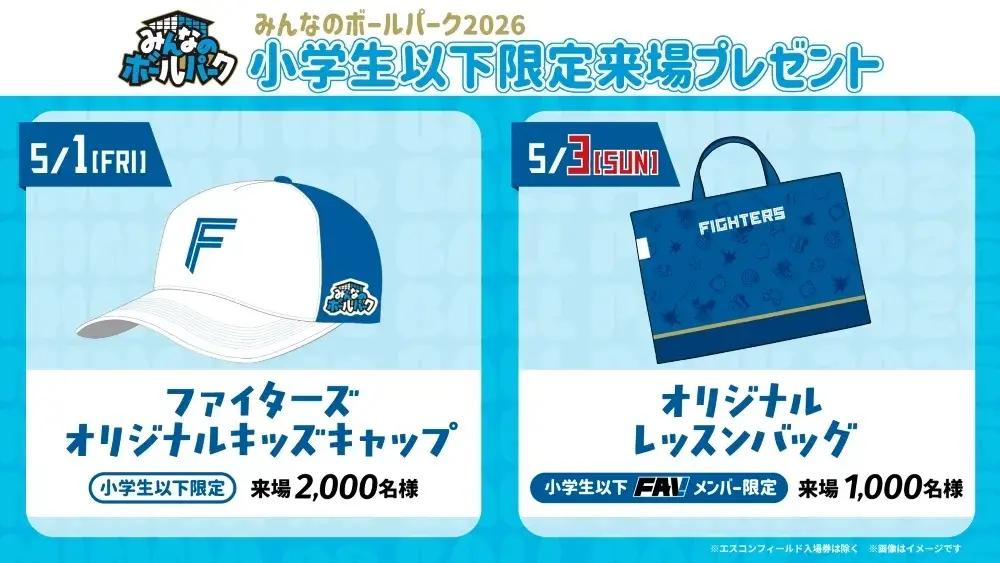 5月1日(金)にご来場いただいた、小学生以下2,000名様へ「ファイターズオリジナルキャップ」を、プレゼントいたします!