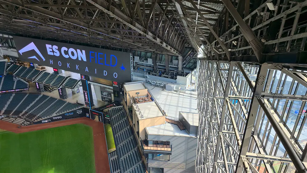 地上70mの高さに位置するこのスカイウォークからは、フィールド全体を一望する圧倒的なスケールの「スタジアム・ビュー」を体験できるだけでなく、エスコンフィールド最大の特徴である開閉式屋根の巨大なトラス構造や、そのメカニズムを間近で観察することができます。