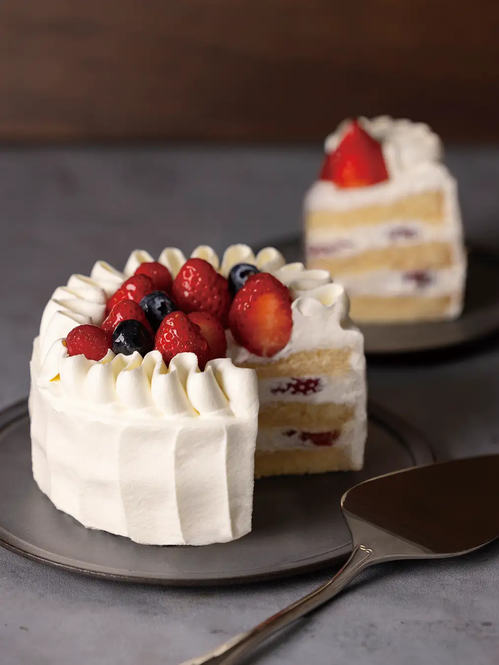 ふわっふわのスポンジと生クリームのバランスにこだわり抜いた、王道のショートケーキ。ストロベリー、ラズベリー、ブルーベリーの3種のベリーが食卓を華やかに彩ります。
