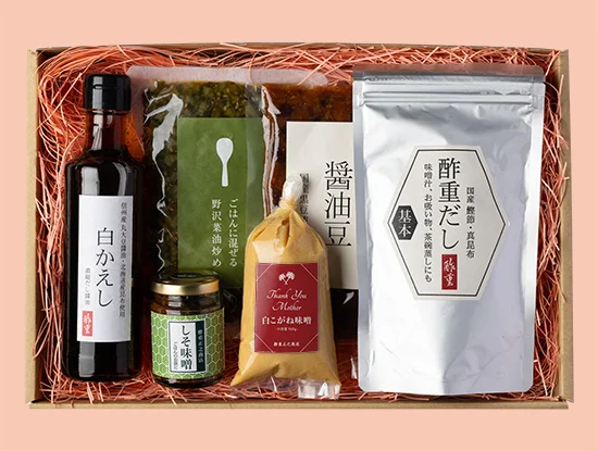 料理に欠かせないお出汁や調味料のセット。母の日限定ラベルの「白こがね味噌」をはじめ、素材にこだわった酢重の味で、家族の“健康”を気遣うお母さんへの感謝を。
