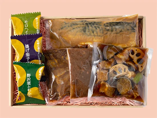 料理がより本格的な味わいになる「味噌・調味料セット」、忙しい日に役立つ「冷凍惣菜セット」、家事の合間にホッと一息「お菓子セット」と、3種のギフトをラインナップ。