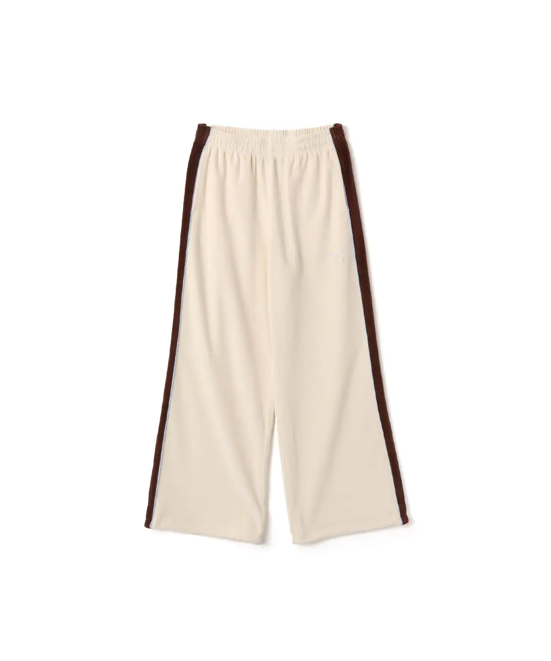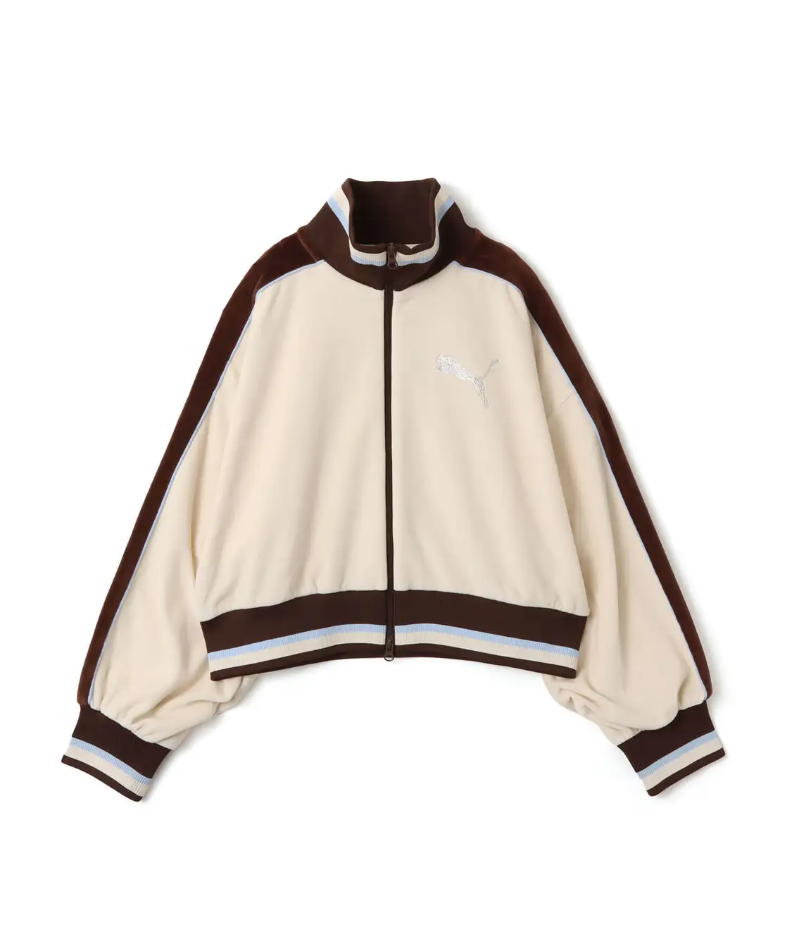 今回の別注作に付随し、「atmos pink」と「PUMA」のコラボレーションアパレルも作製。トレンドカラーのブラウンとデニムを意識したブルーカラーがポイントのベロア素材のジャージのセットアップとナンバリングのプルオーバーが完成しました。