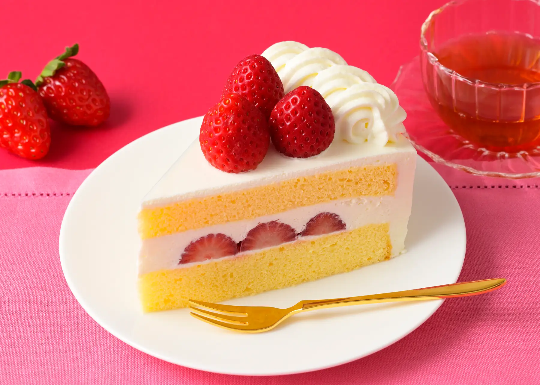 甘さと酸味のバランスがよい紅ほっぺと、ミルク感とコクがある風味豊かなクリーム、銀座コージーコーナーオリジナルの小麦粉を使用してきめ細かくふわふわに焼き上げたスポンジを存分にご堪能ください。