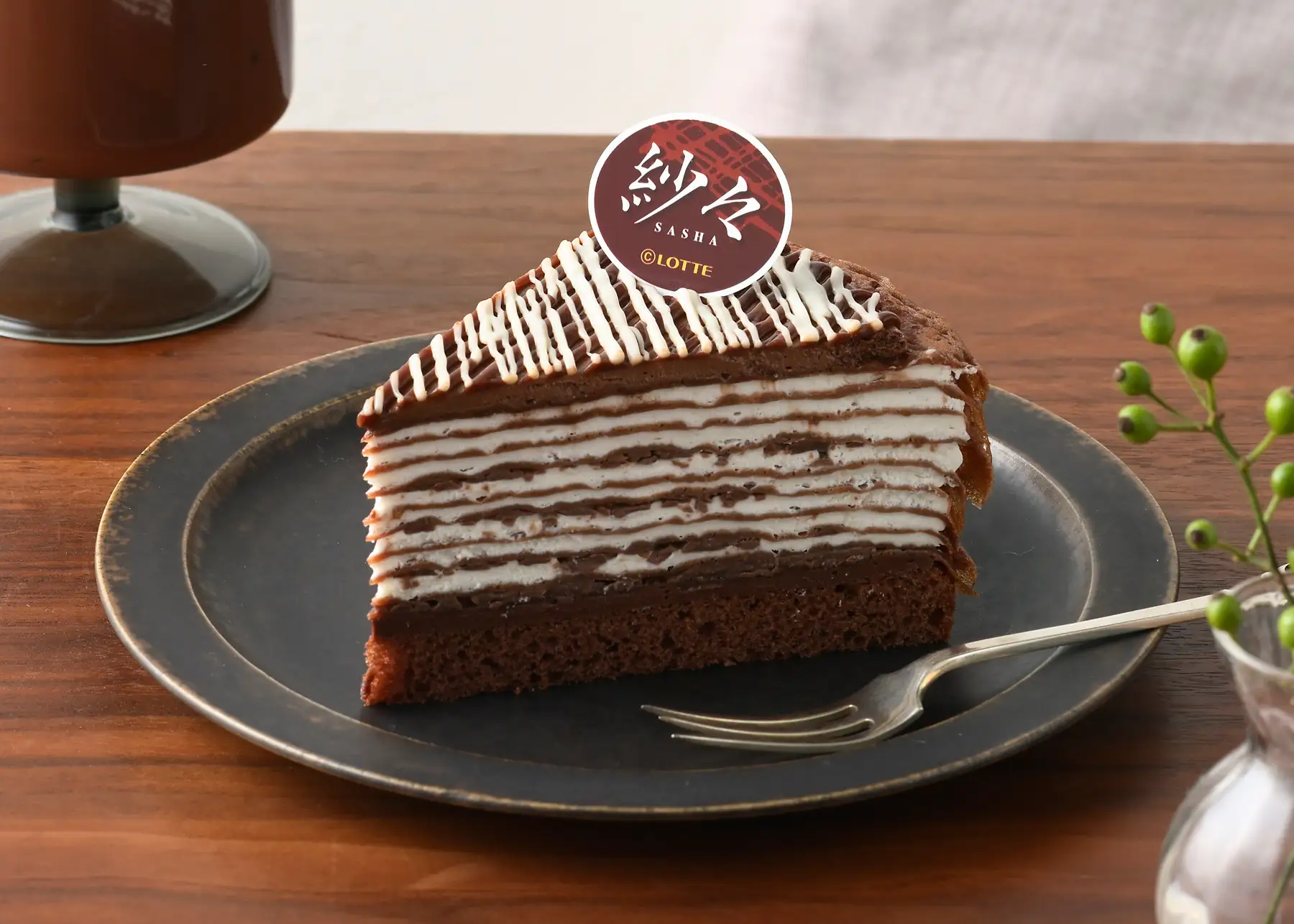 特長:銀座コージーコーナーの「ミルクレープ」とロッテのチョコレート「紗々」がコラボレーション。ココアクレープと生クリーム入りホイップクリームを重ねて、パリパリチョコを4層にサンド。上面は2種のソースで細い線が幾重にも重なる「紗々」をイメージして仕上げました。「紗々」の繊細な見た目や、ほどける口どけ、チョコレートのパリパリ食感をお楽しみください。