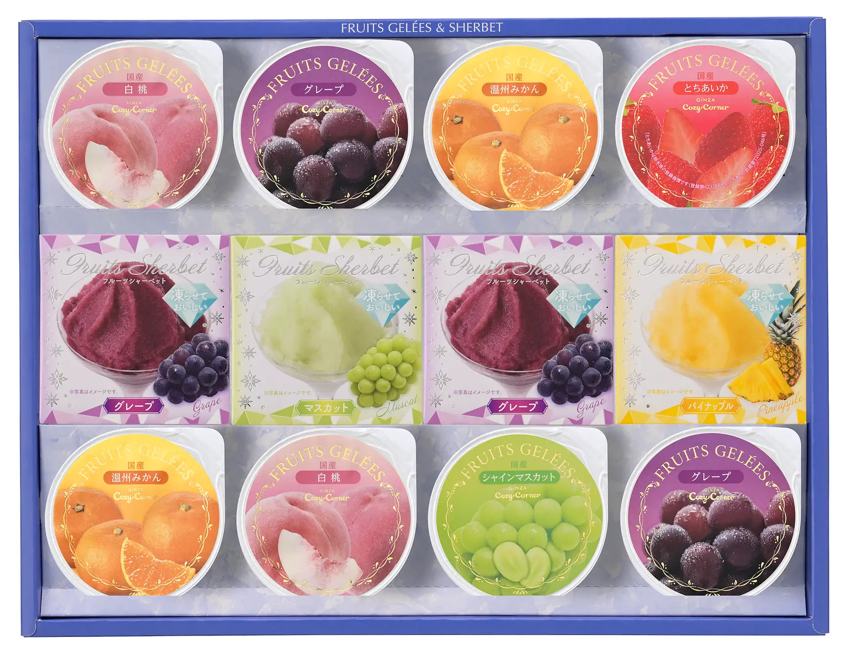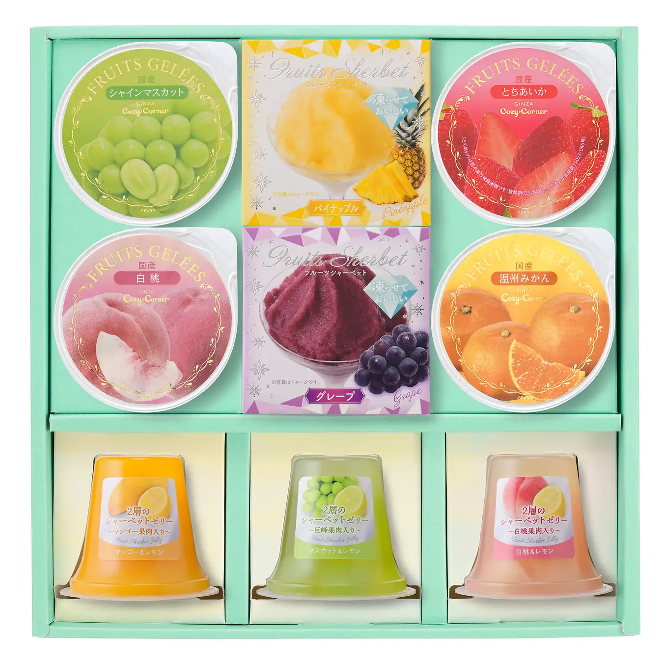 内容:フリュイジュレ(白桃、温州みかん、グレープ)各2個、フリュイジュレ(シャインマスカット、とちあいか)各1個、フルーツシャーベット(グレープ)2個、フルーツシャーベット(マスカット、パイナップル)各1個