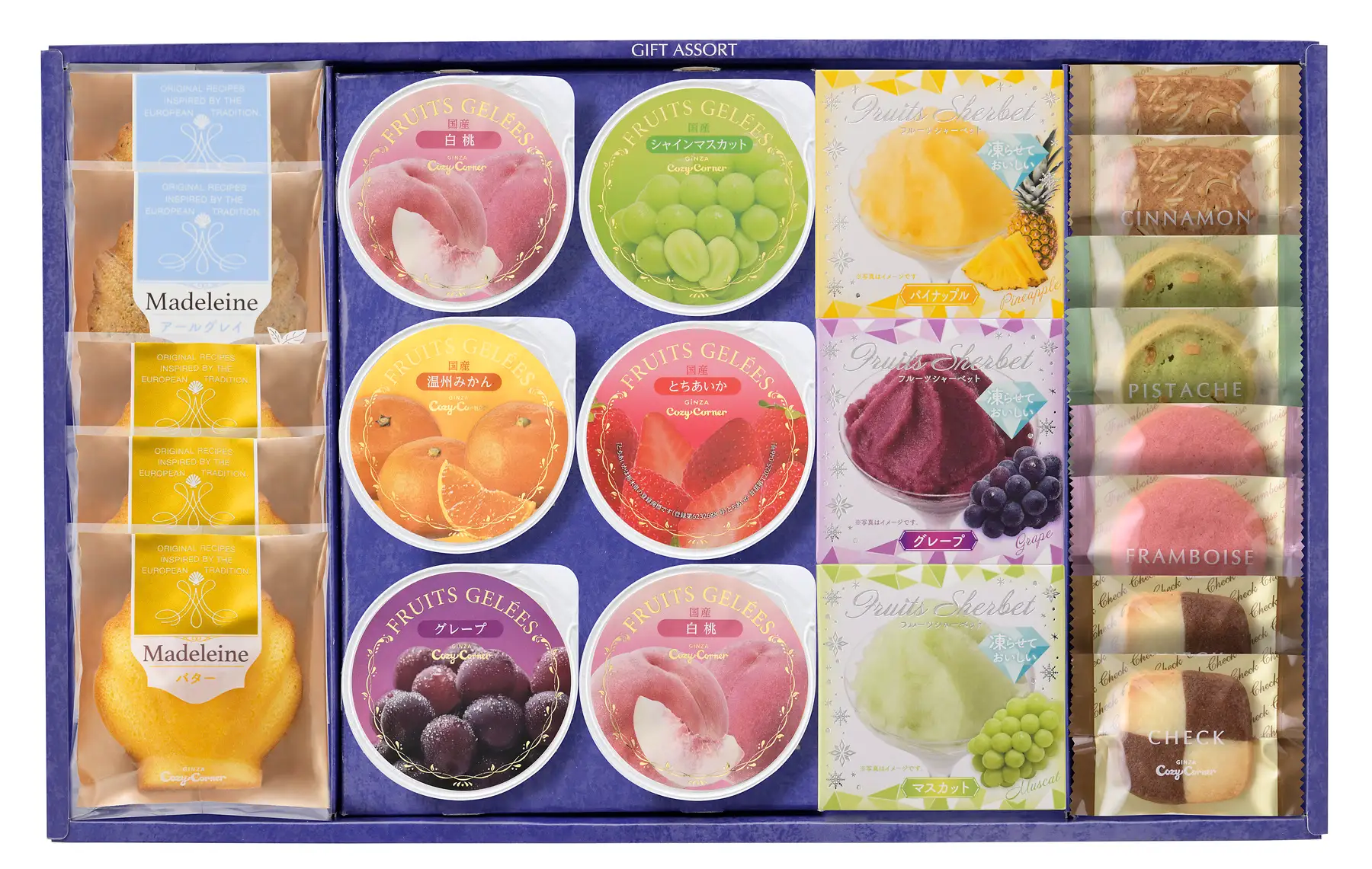 特長:フルーツ果汁やピューレを使用した、みずみずしく口あたりなめらかな「フリュイジュレ」。フルーティーでなめらかな味わいを凍らせて楽しむ「フルーツシャーベット」。風味豊かに焼き上げた2種のマドレーヌと、4種のクッキーを詰め合わせました。