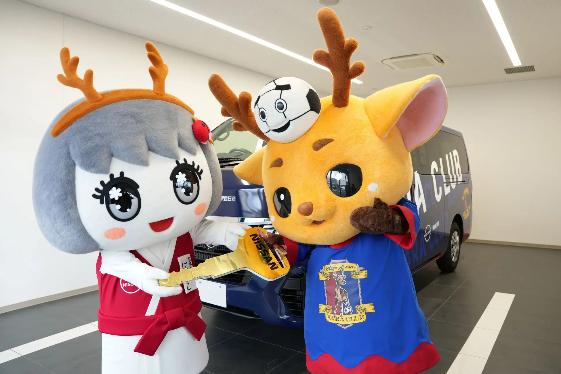 奈良クラブ様のマスコットキャラクター「シューカくん」と、奈良日産のマスコットキャラクター「ならにちこ。」が揃って登場し、記念撮影を行うなど、和やかで一体感のある式典となりました。