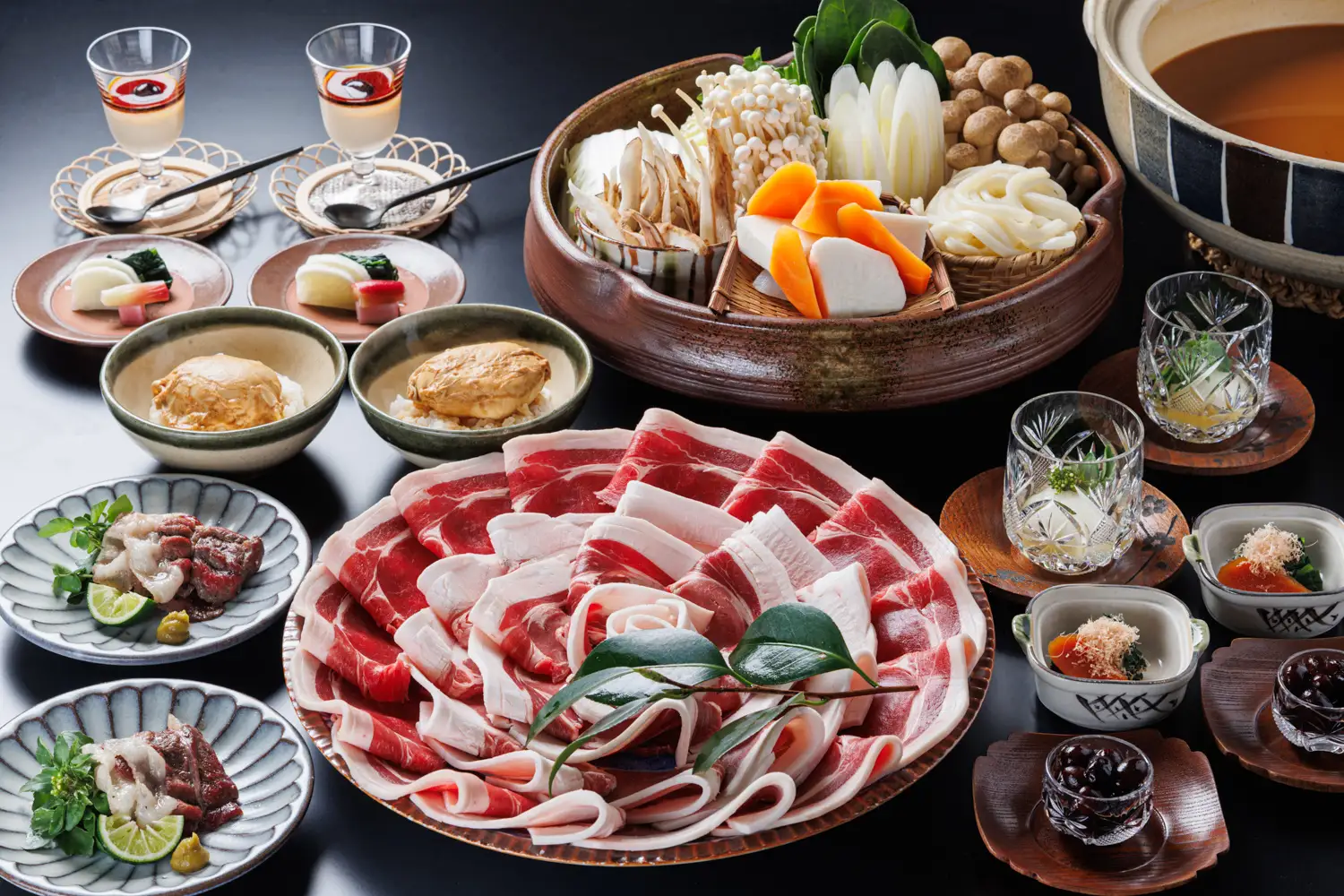 本宴会プランでは、ぼたん鍋を中心に、丹波篠山の旬の食材を取り入れた料理構成とし、気の置けない方々との会話を楽しみながら、ゆったりとした時間をお過ごしいただけます。歴史ある建物と落ち着いた空間の中で、地域の食文化と四百年の伝統を体感できる内容となっています。
