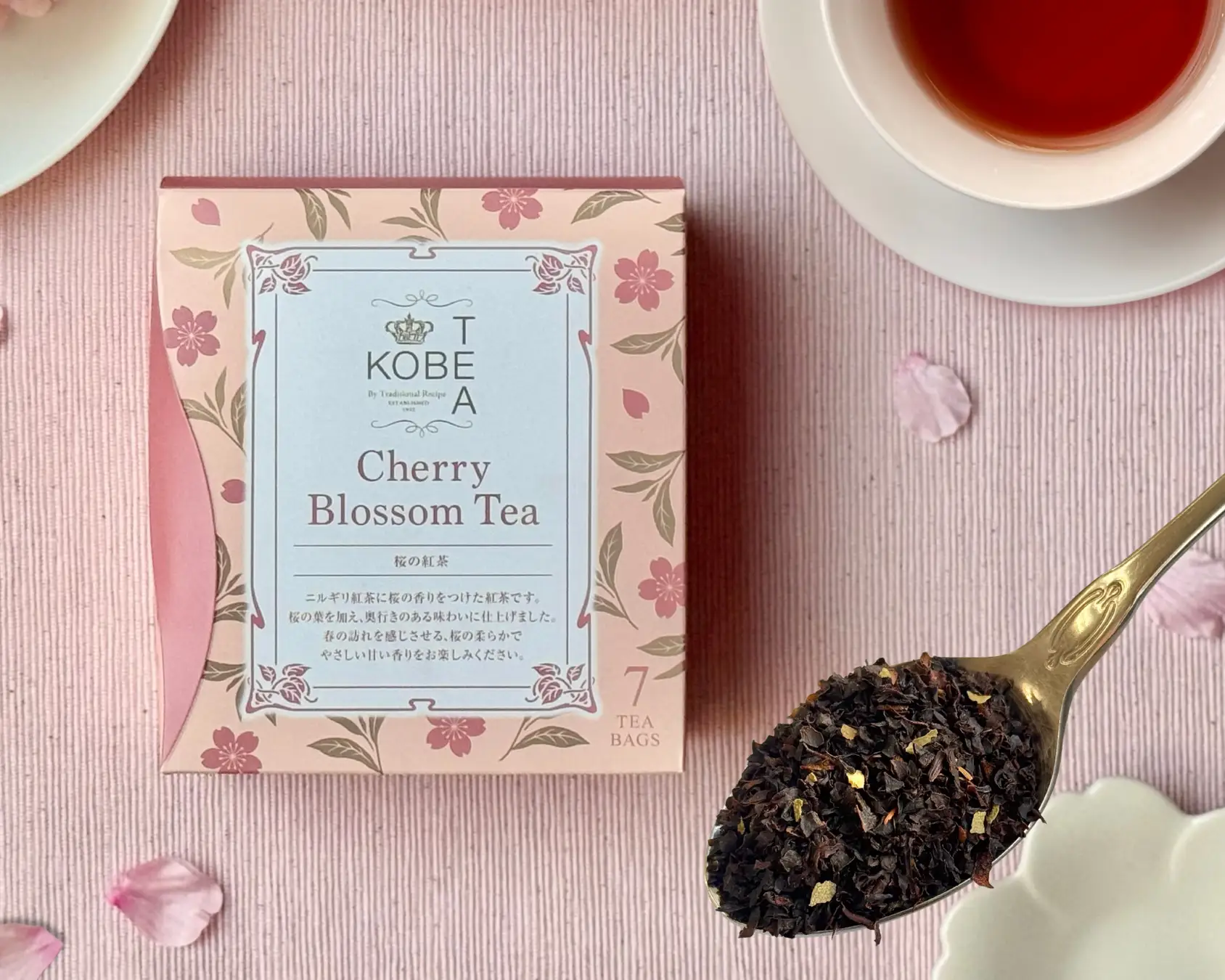 毎年高い人気を誇る神戸紅茶のフレーバードティー「桜の紅茶」が、今春、いっそう香り豊かになって登場。甘くやさしい香りの奥に、本物の桜の葉がもつ柔らかな余韻を感じる、春のティータイムにふさわしい一杯に仕上げました。