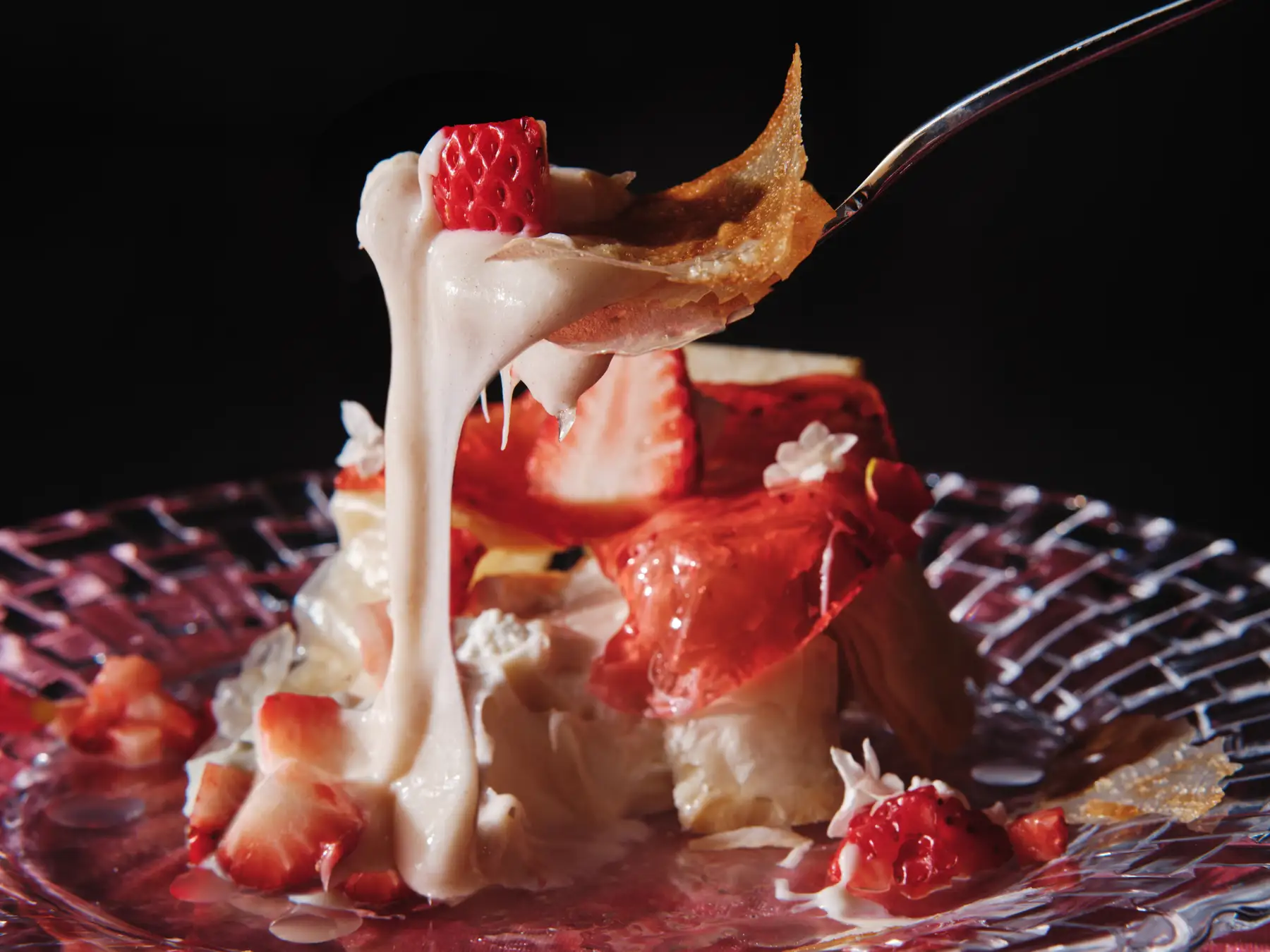 一見すると繊細なミルフィーユを彷彿とさせるその正体は、餅の代わりに極薄のパイ生地「パートフィロ」を幾重にも重ねて焼き上げたもの。フォークを入れた瞬間に響く「バリッ」という軽快な音はこれまでのいちご大福のイメージを鮮やかに裏切ります。