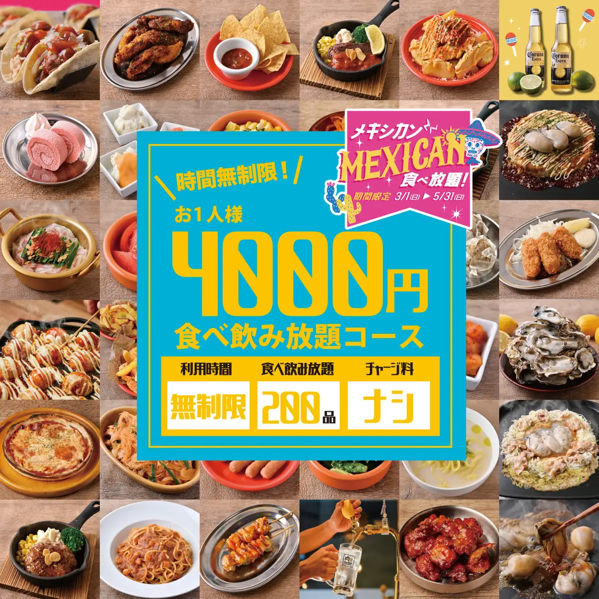 TikTokで話題沸騰!「肉ときどきレモンサワー。」がメキシカンに染まる!タコスもステーキも”ぜ~んぶ食べ放題”の『メキシカン食べ放題フェア』3/1(日)より開催