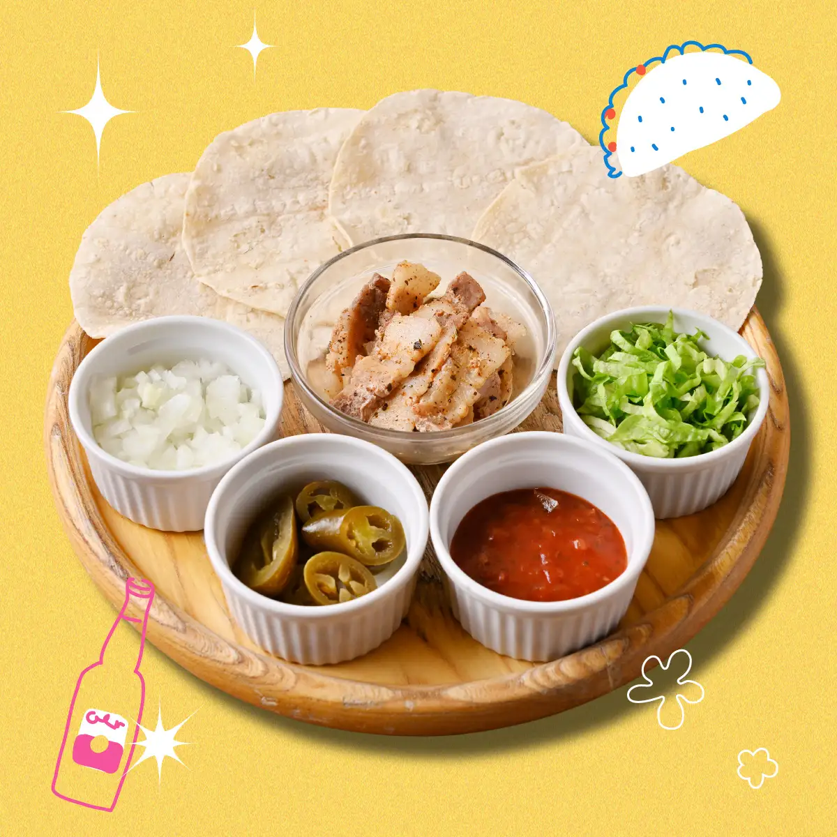 刺激的な香りが広がる「ビーフ」、旨みあふれる「ポーク」、香ばしい「チキン」。お好みの肉をトルティーヤで包んで楽しむ“セルフスタイル・タコス”で、陽気なメキシカンパーティーのはじまりです!