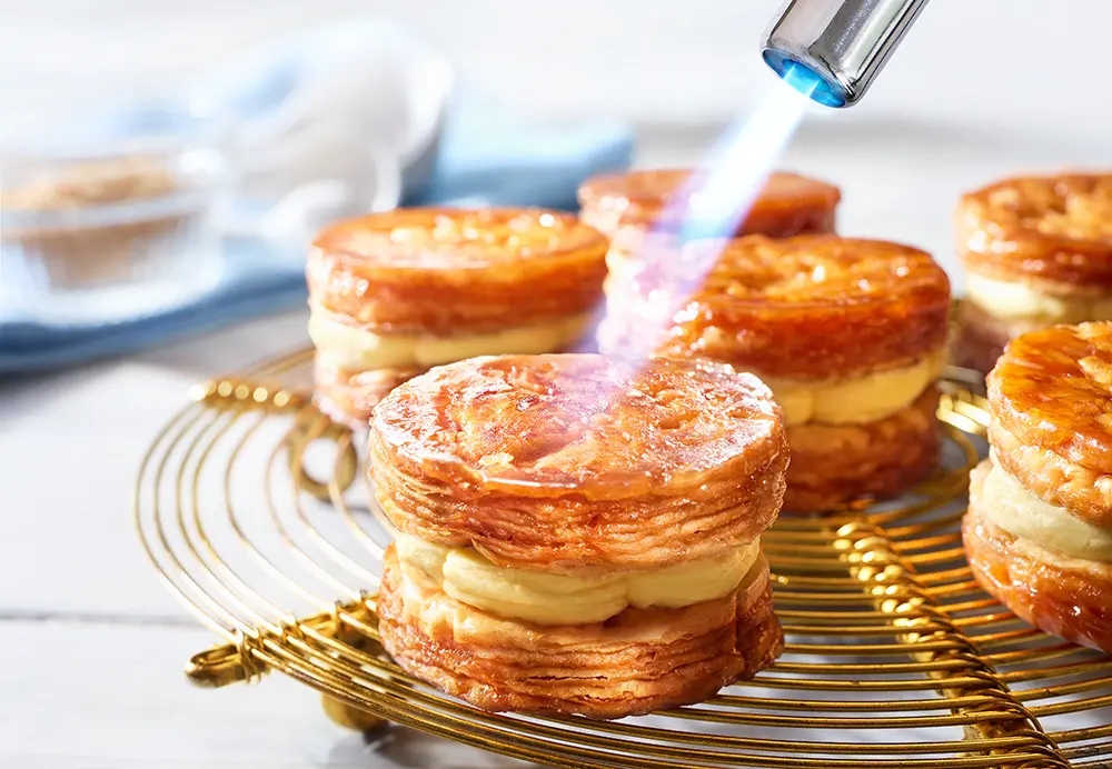 パリッとブリュレが美味しいあのクイニーアマンのようなパイ生地に、クリームをサンドした欲張りスイーツ。キャラメリゼしたカリッと食感と、バターの香り漂う多層感のあるパイ生地はまるでクイニーアマン!さらにギルティに、チーズショコラクリームをぷっくりと挟んだら、挟んだら、背徳感溢れるご褒美スイーツが完成しました。