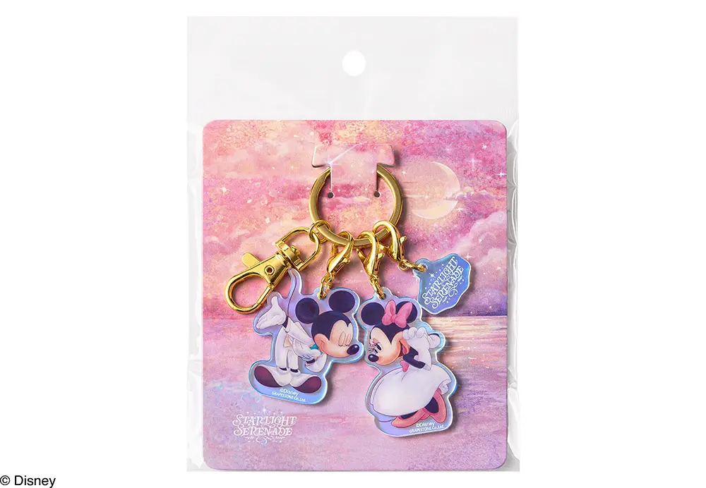 「ミッキーマウス」と「ミニーマウス」、「スターライトセレナーデ」のロゴが付いた3種セットのアクリルキーホルダーです。それぞれ取り外して使えるので、仲良しのお友達とシェアして使っても!スペシャル缶とのセットは、どちらもオーロラ加工で見ているだけで幸せな気持ちにしてくれます。
