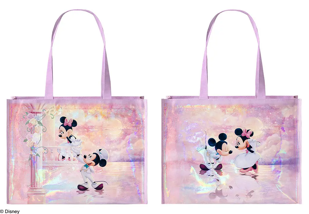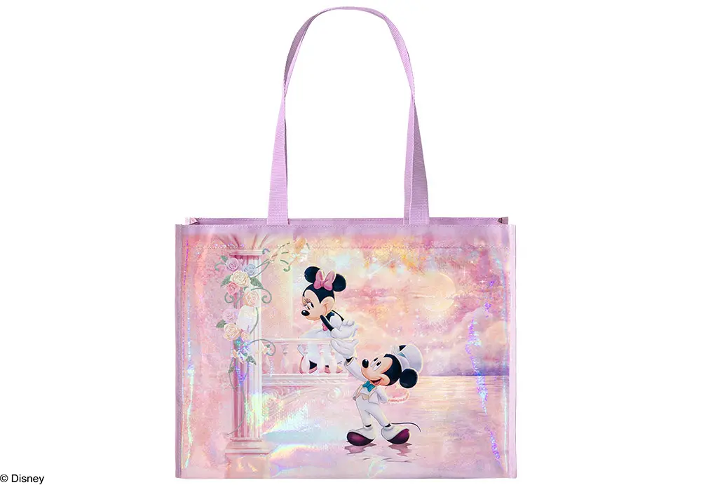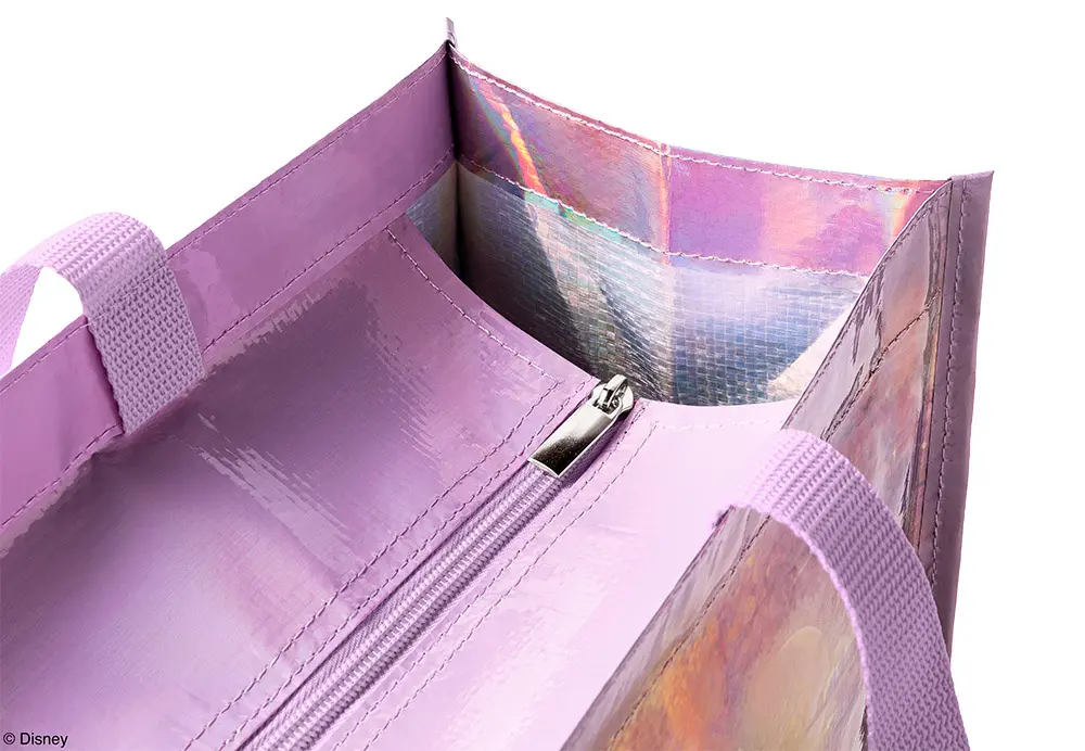 マチ付きで荷物もたっぷり入るショッピングバッグは、表裏異なるデザイン。オーロラ加工で角度を変えるときらっと輝き、いつでも持ち歩きたくなる可愛さです。日常使いはもちろん、ファスナー付きなので旅行やテーマパークへのお出かけにも大活躍!