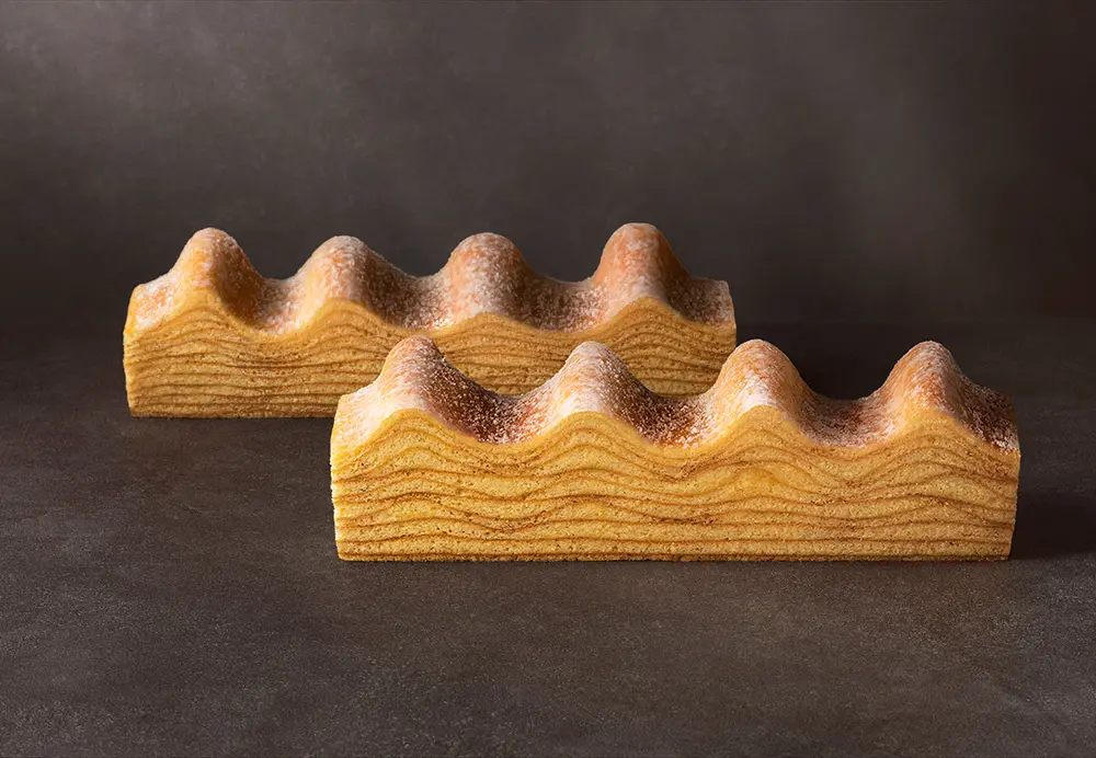 丁寧に焦がした砂糖とミルク。ひと手間かけた材料から生まれたゴールドショコラ。まるでキャラメルのように、⾹ばしくコク深い味わいをお楽しみいただけます。生地は、ねんりん家の代表作『マウントバーム しっかり芽』。⼀層⼀層繊細に焼きあげて、中はしっとり熟成。濃厚なバタ―風味のバームクーヘンにゴールドショコラをとろりとかけた、特別な一品です。