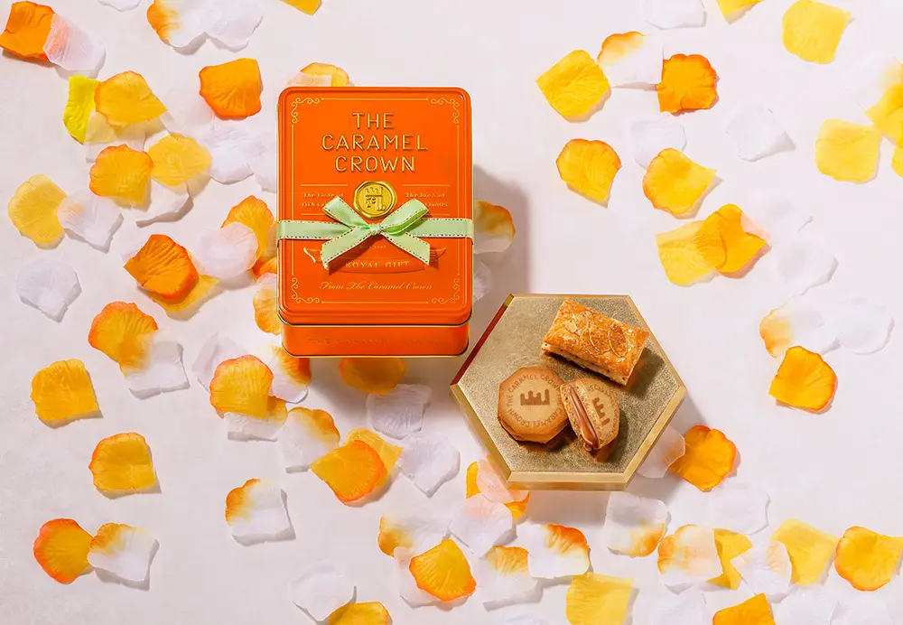 ブランドカラーであるオレンジ色が華やかな、ときめきがつまったスイーツ缶。デザインテーマは「キャラメル王室からの贈り物」。封蝋印をイメージしたゴールドのロゴマークは、美味しいキャラメルスイーツの証です。華やかなひとときを感じていただきたくて、見た目も手触りにもこだわったエンボス加工仕上げ。春色の爽やかなリボンをまとって、ホワイトデーはもちろん、入学や卒業など新たな門出をお祝いするギフトにもおすすめです。