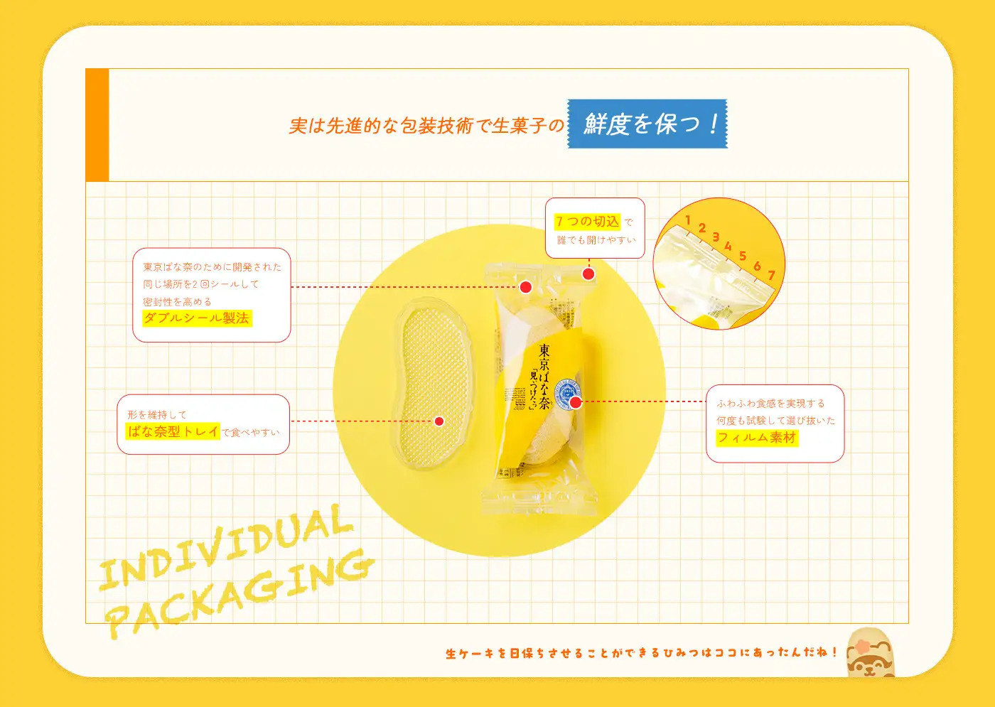 新鮮なスポンジとクリームでできた「生菓子」である東京ばな奈が、常温で日持ちするのはなぜ?厳しい衛生テストに合格した安心原料、厳しい衛生管理を徹底した安全工場、袋内を酸素ゼロにして鮮度を保つ包装技術、3つの努力の賜物です。