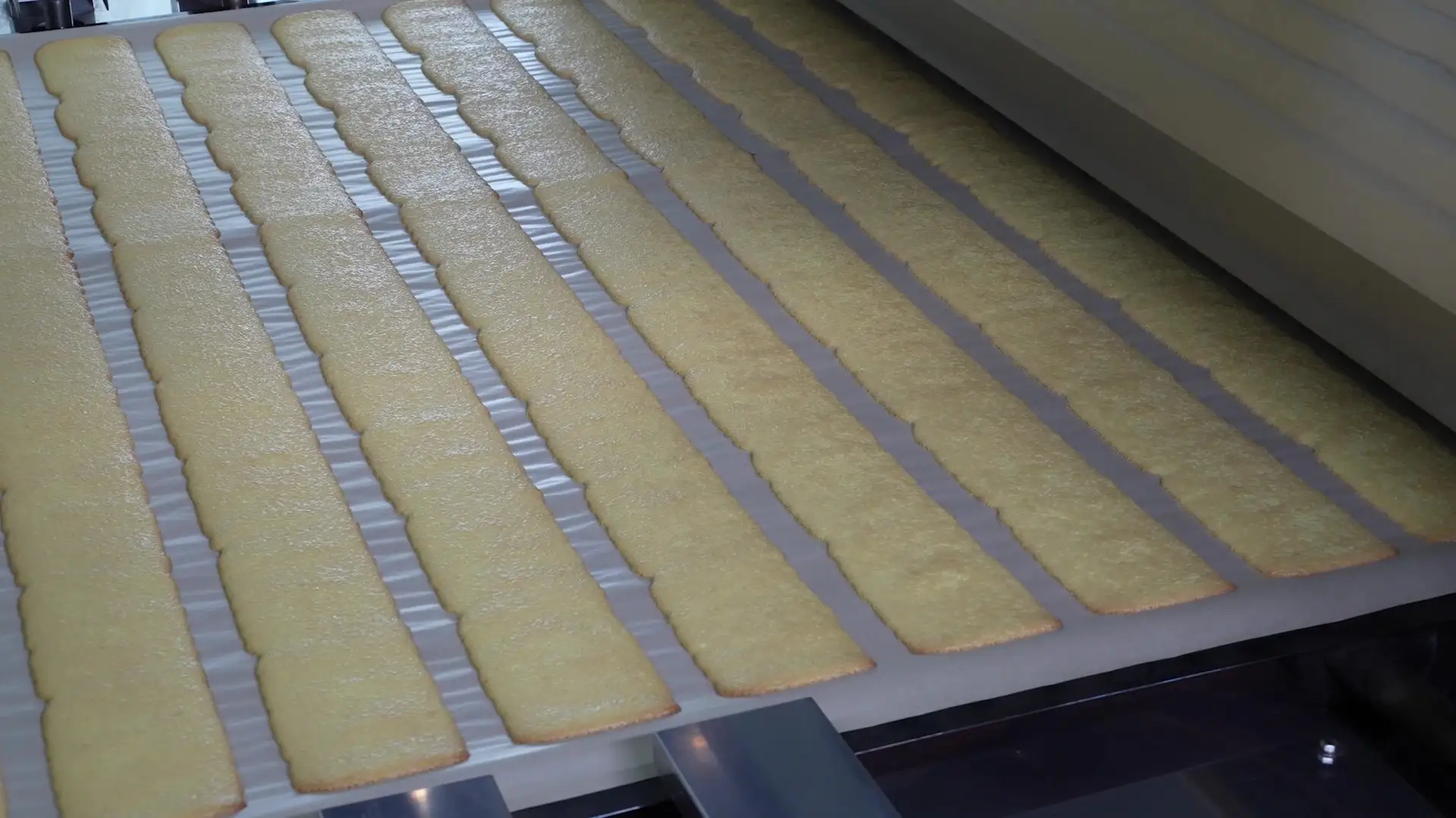 スポンジの工夫、ふたつ目は「焼き蒸し」。全長12メートルの巨大トンネルオーブンでじっくり焼き上いた後、さらに蒸すことで、東京ばな奈独自のしっとりふわふわ食感が生まれています。