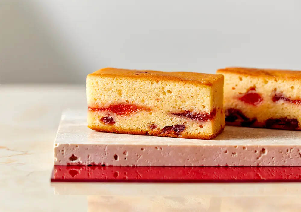 あまおう苺100%の果肉と果汁をとろっと煮詰めた優しい甘さのコンフィチュールに、クランベリー果肉のしっかり食感を加え、クリームチーズとカマンベールチーズで、じっくり・しっとり・ジューシーに焼き上げました。