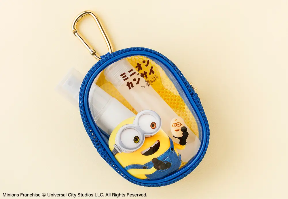 さらに今回新登場の「メッシュポーチ」も見逃せません。青と黄色のミニオンカラーで鮮やかに仕上げたポーチは、「チョコバナナケーキ」のパッケージとお揃いの「ボブ」をデザイン。よく見るとジッパーのチャームも『ミニオンinカンサイ チョコバナナケーキ』になっています。表と裏でボブとケビンの両方が楽しめる、こだわり仕様です。