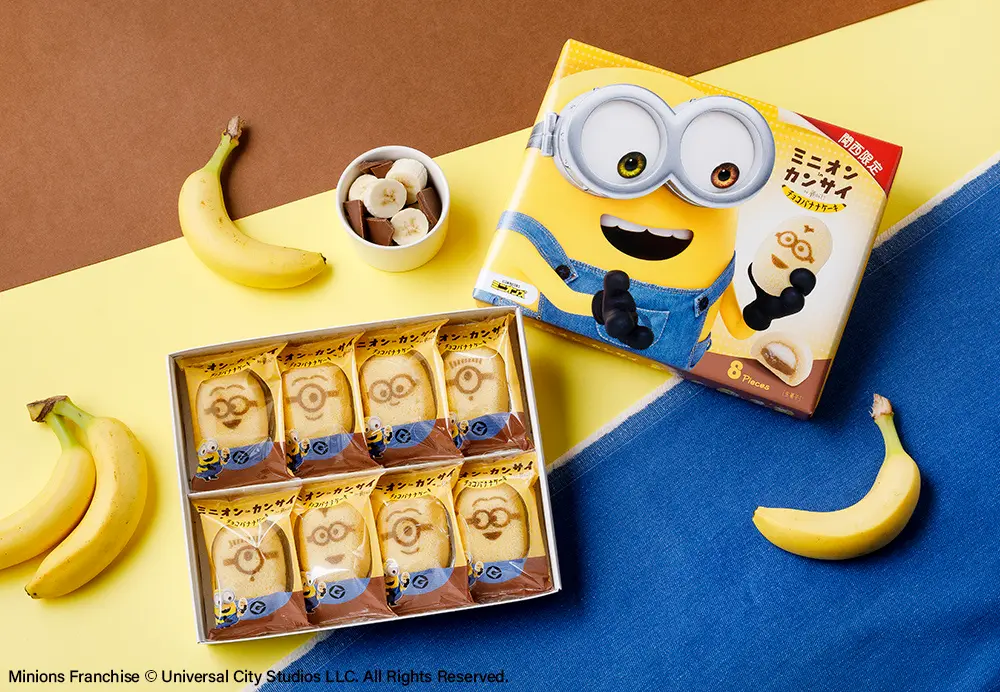 ミニオンと、東京ばな奈を生み出したスイーツブランド「銀のぶどう」がコラボレーションした関西限定スイーツブランド「ミニオンinカンサイ」。2023年7月の発売から、累計販売数560万個を突破した『ミニオンinカンサイ チョコバナナケーキ』が、この度パッケージを新たに登場いたします!
