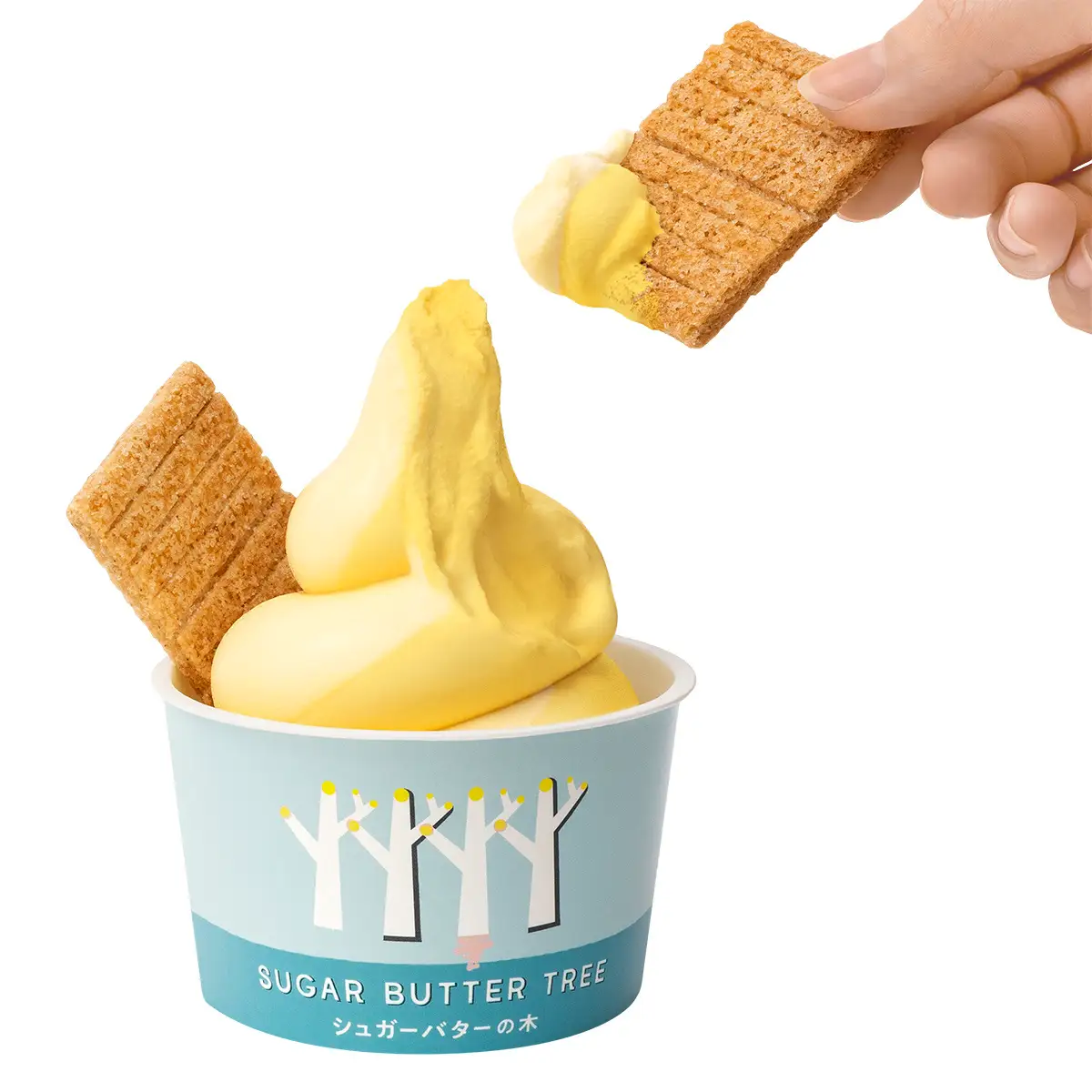 ソフトクリームには「シュガーバターの木」の自慢のシリアル生地を2枚もトッピング!そのまま食べて「シュガーバターの木」ならではのザクザク感を楽しんでも、ソフトクリームをディップして食べるのも、いろんな食べ方が楽しめます。ドライブ途中、ついついサービスエリアに立ち寄って食べたくなるソフトクリーム。香ばしいシュガーバターの木の生地と一緒に“ザクふわ”食感をめしあがれ。