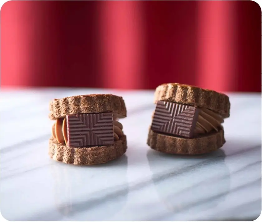 ミルクのコクとフローラルに香るチョコのガリッと感の後に、濃厚チョコ餡クリームがなめらかに広がって、最後はひとつに溶け合う贅沢な余韻を楽しめる大人のご褒美サンド。