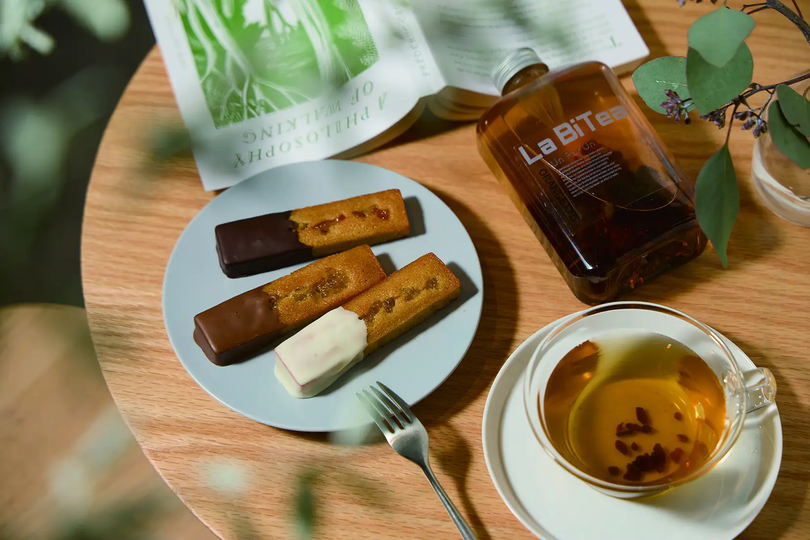 オレンジオイルで香りづけしたカカオハスクのハーブティーに、オランジェット風のフィナンシェのマリアージュ。生地のほのかな塩味が、オレンジの甘い香りを引き立てます。
