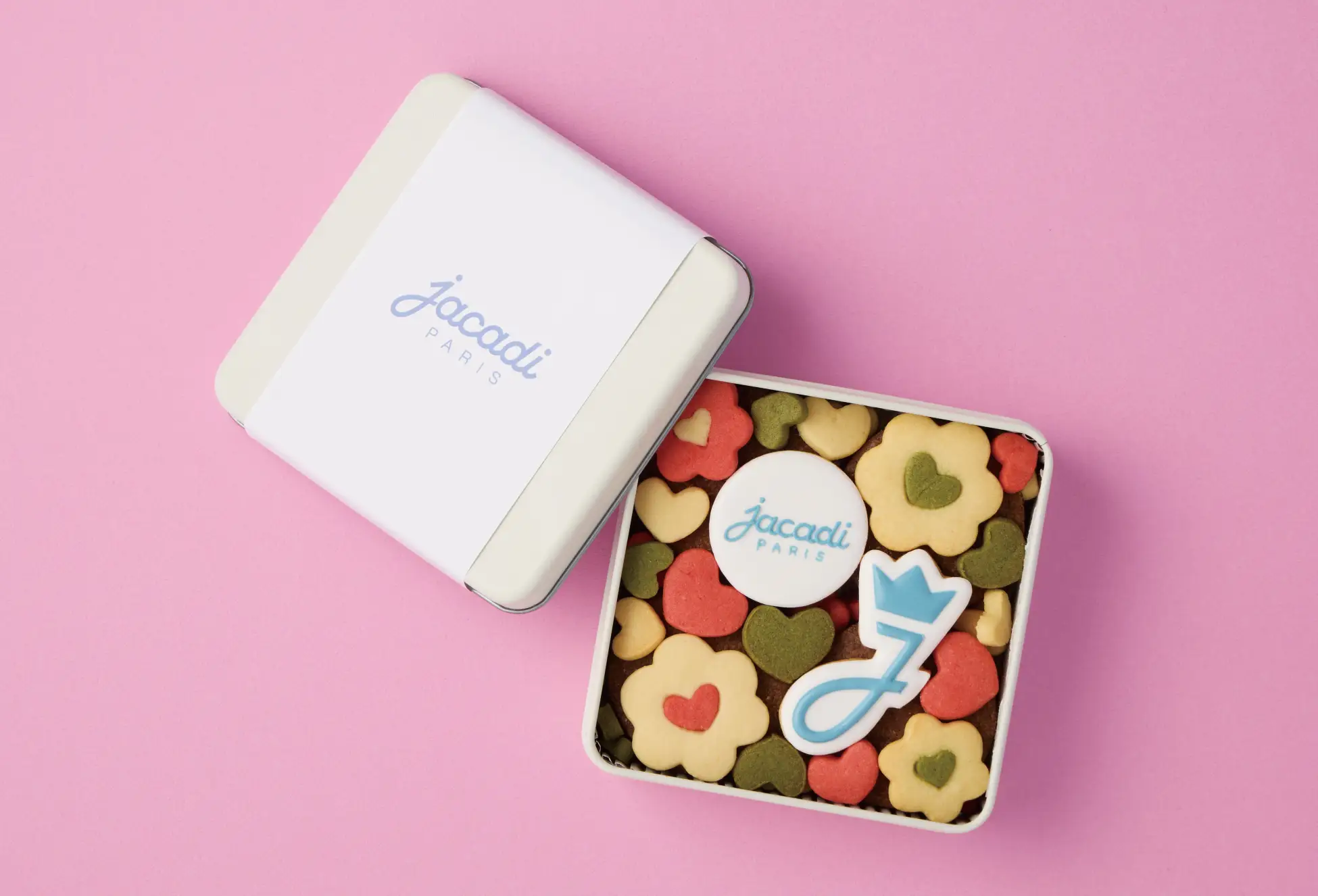フランスのこども服ブランド「Jacadi」と、「Sugarty」シュガーアーティスト助川裕香とのコラボレーションが実現。「Jacadi」ロゴのアイシングクッキーを中心に、抹茶とプレーンのハートやフラワークッキーを詰めたクッキー缶が初登場します。下段にはココアクッキーが隠れており、食べ進めるたびに違う美味しさに出会えます。