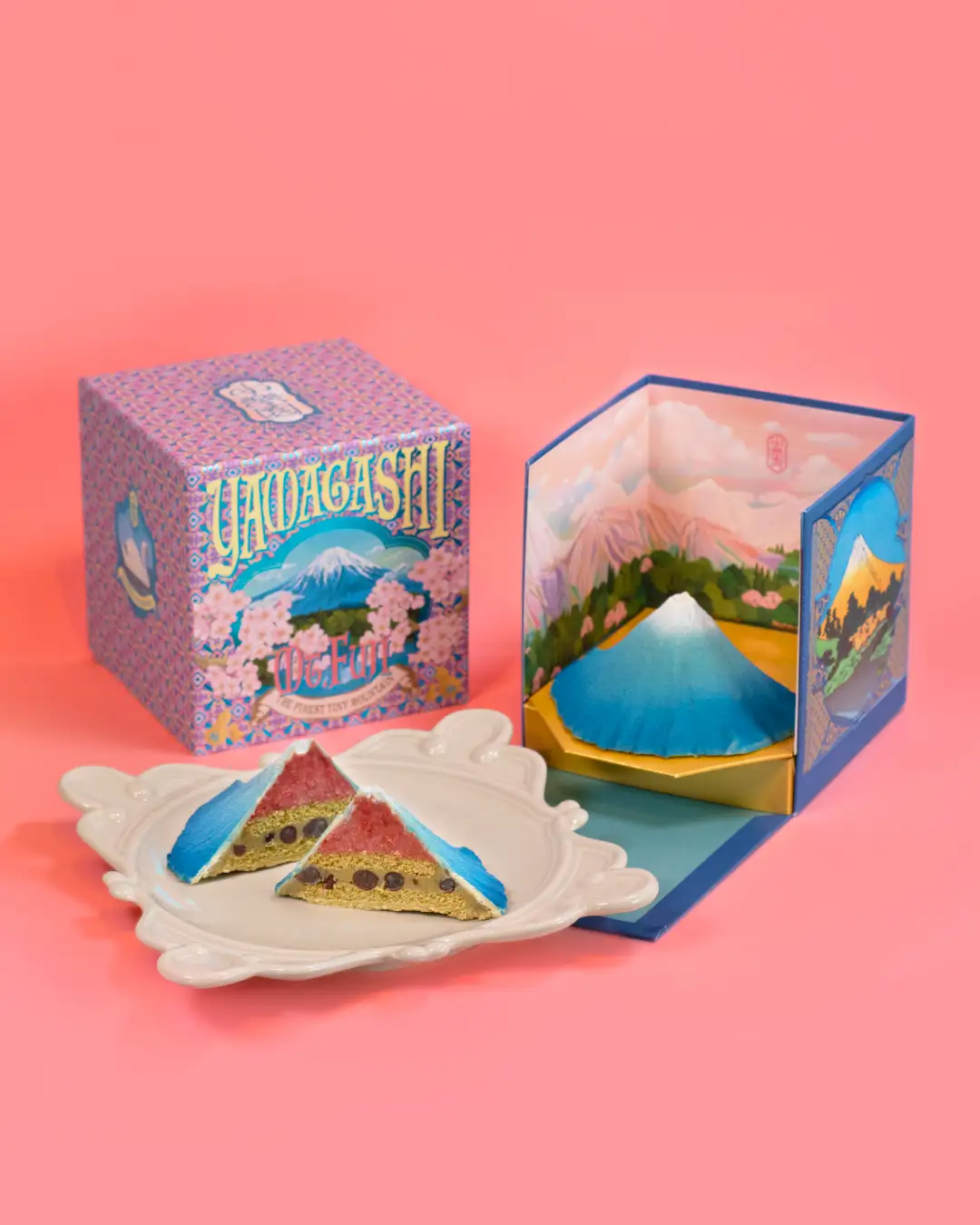 日本最高峰の山”富士山”を手のひらサイズに細密に再現した、食べられる箱庭のようなチョコレート菓子。薄いチョコレートの山肌を崩すと、山頂には苺と桜の塩漬けを練り込んだガナッシュ、中段には抹茶のケーキと小豆。その下に桜の葉のガナッシュを重ねた、春の訪れを感じる味わいです。山底は静岡県産の抹茶を使用しています。