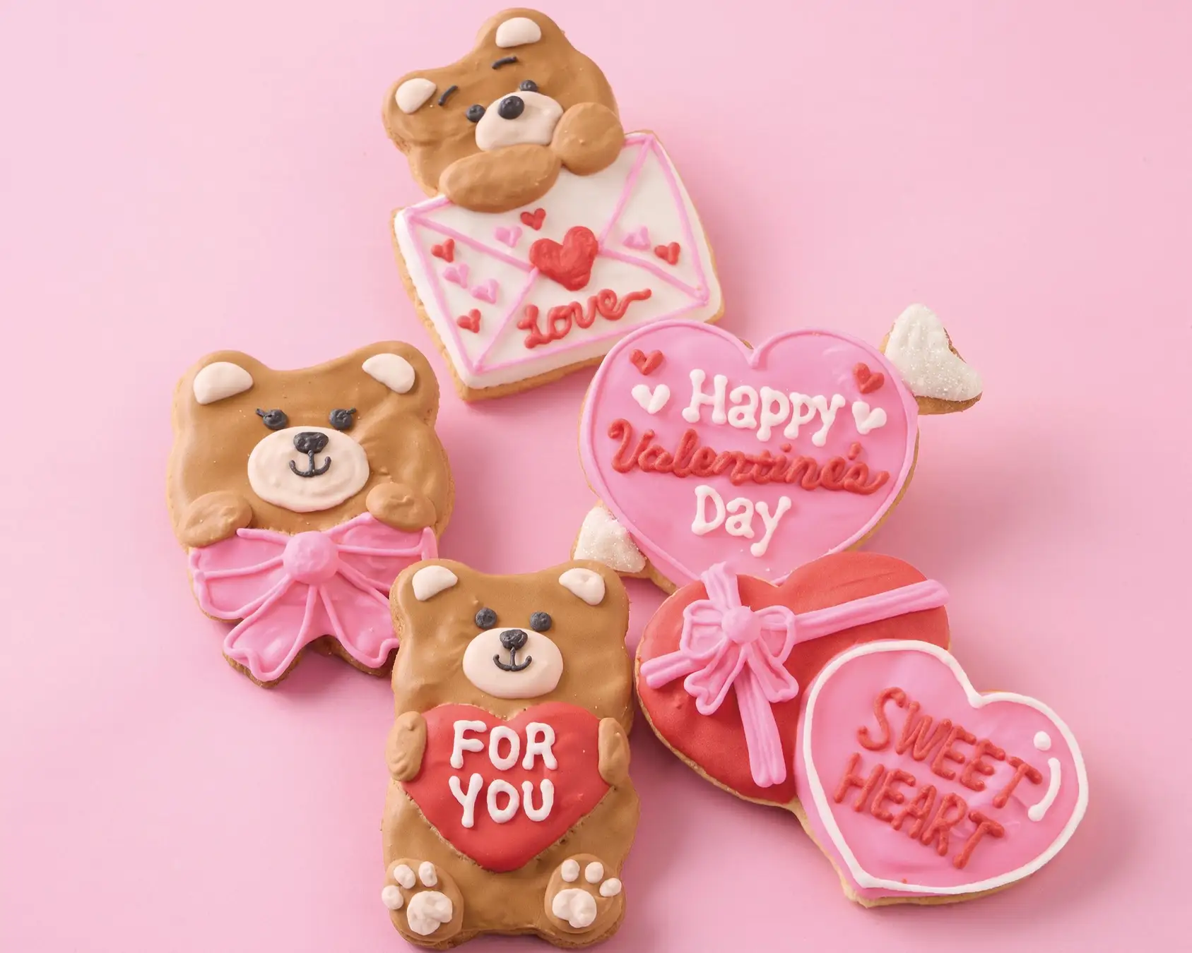 今回は、毎年実店舗でも大人気のバレンタインアイシングクッキーを展開。バレンタインらしいレッドやピンクのカラーを基調に、バレンタインならではのモチーフやメッセージがたくさん入っています。ラブリーなベアーも登場。