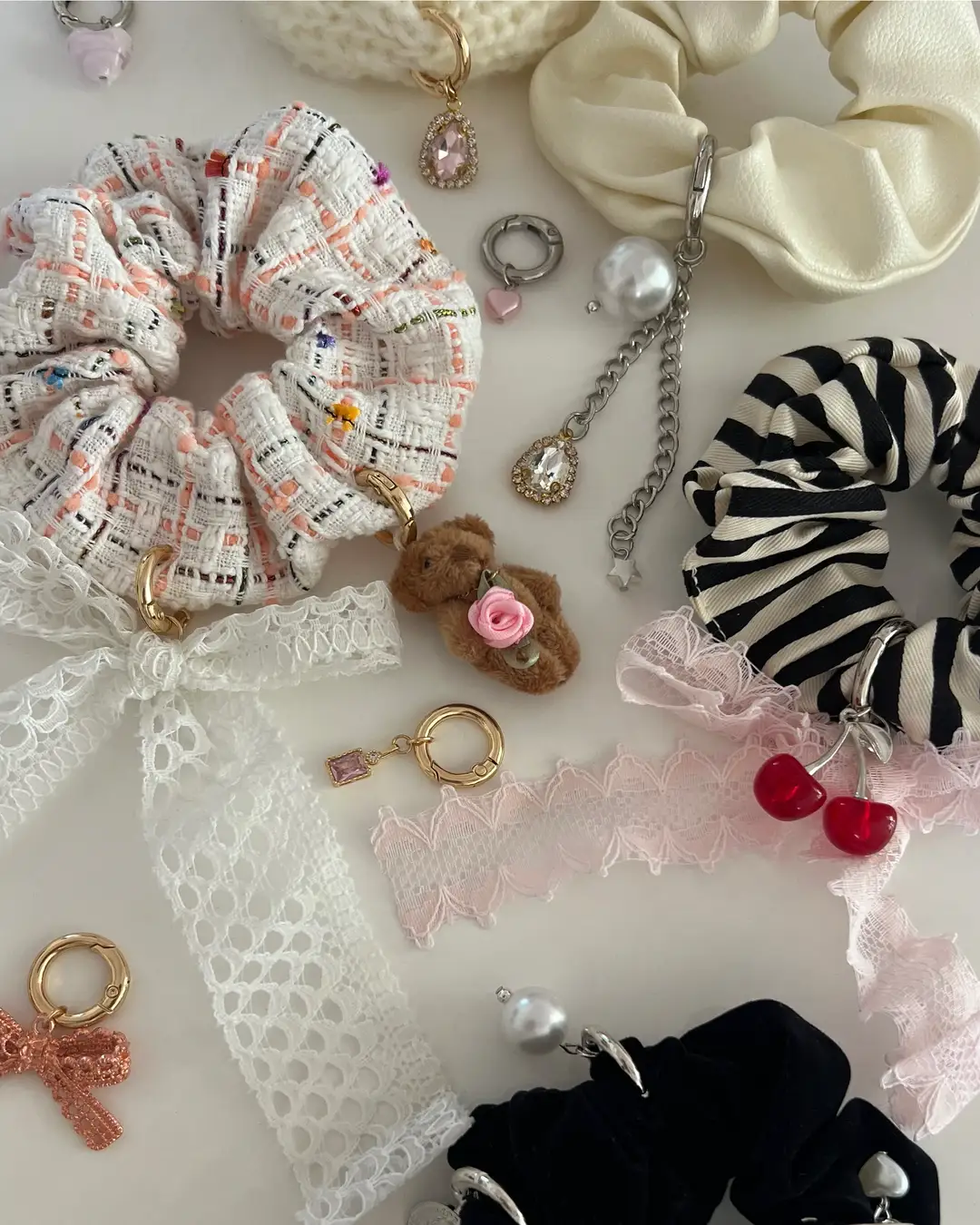 シュシュの種類は10種類以上、カスタマイズできる新作パーツも豊富にご用意しています。
