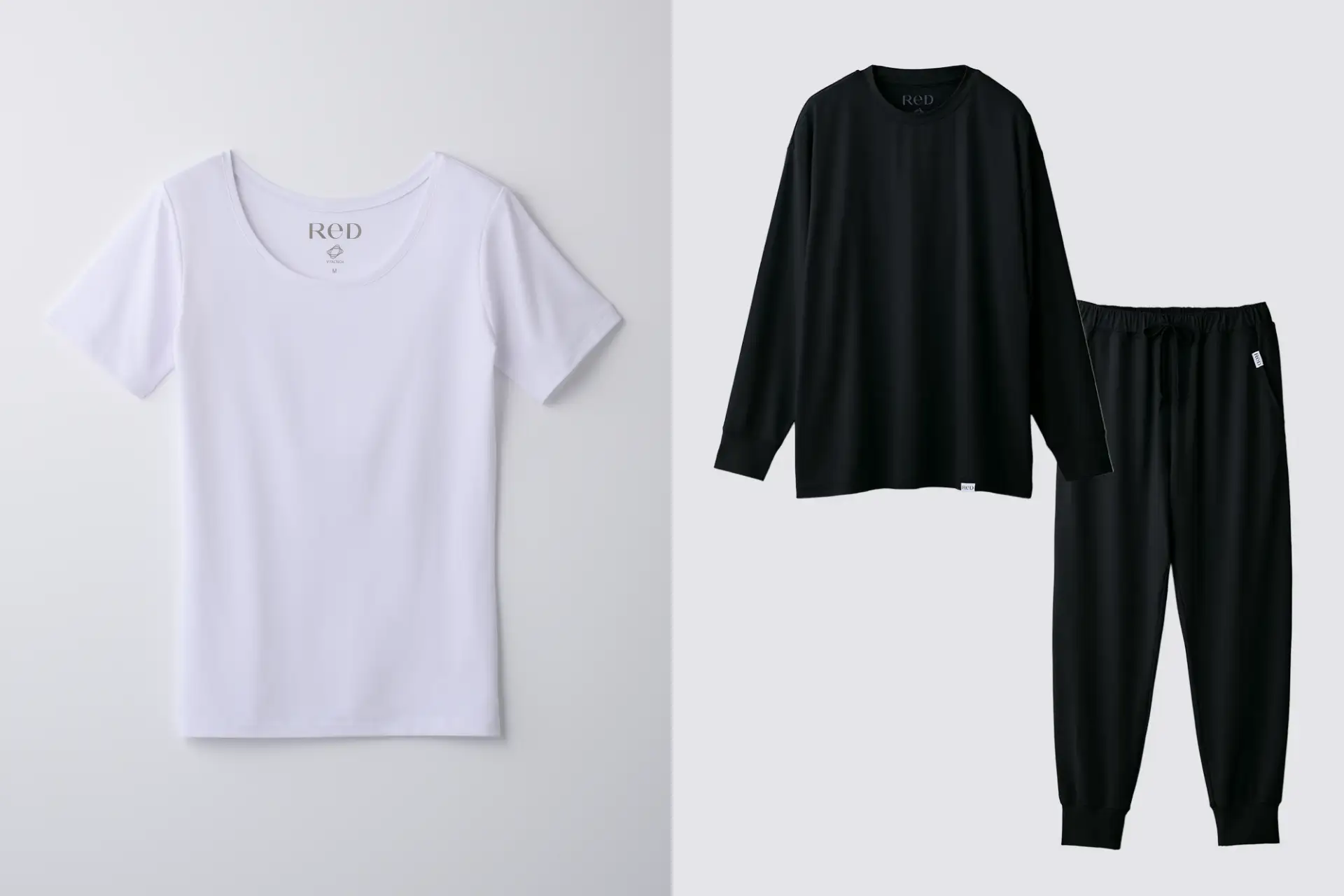 左)Uネックインナー半袖【女性用】3,960円、右)スリープ プルオーバー長袖【男女兼用】7,700円、スリープ ジョガーパンツ【男女兼用】7,700円