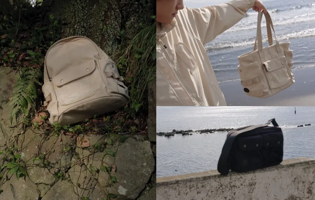 「POTR × DAIWA」デイパック 57,200円、トートバッグ 53,900円、ショルダーバッグ 42,900円 ※カラーは全モデルDESERT BEIGE/INK BLACKの2色展開。