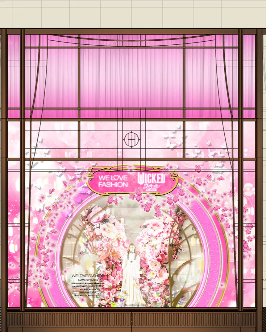 『ウィキッド 永遠の約束』のエルファバとグリンダをイメージした、春の特別なウィンドーが登場。エルファバの「強さ」とグリンダの「優しさ」。二人の世界観にインスパイアされた、花のようにたおやかで芯のある春のファッションを提案します。 また劇中で実際に使用された貴重なプロップ(小道具)を特別展示。特に4号ウィンドーでは、物語のクライマックスへと続く「黄色いレンガの道」を螺旋状に再現。限定コラボレーション商品や、予告編・インタビュー映像とともに『ウィキッド』のドラマチックな魔法の世界へと誘います。