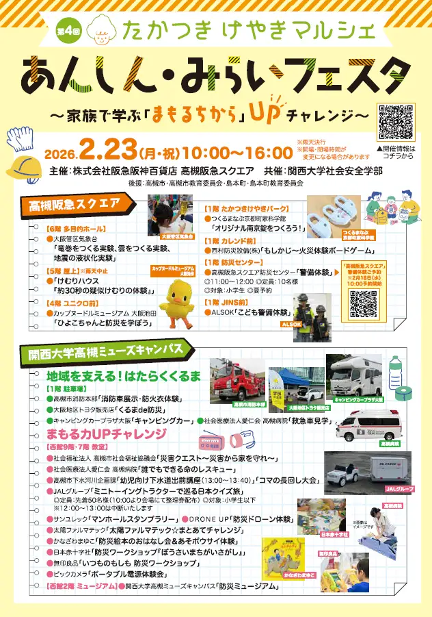 エイチ・ツー・オー リテイリングループの株式会社阪急阪神百貨店(本社:大阪市北区、代表取締役社長:山口俊比古)が運営する高槻阪急スクエアは、2026年2月23日、同店と関西大学 高槻ミューズキャンパスにて、子育て世代に向けた地域イベント「たかつきけやきマルシェ」を開催します。第4回となる今回は、「あんしん・みらいフェスタ ~家族で学ぶ『まもるちから』UPチャレンジ~」と題し、防災・防犯・環境に関する知識とスキルが学べる体験型のコンテンツを通じて、家族や地域の安全・安心への意識向上と、地域への愛着の醸成を図ります。 高槻阪急スクエアは、『集いのきっかけを提供することで、高槻ママたちを元気にしたい!』をコンセプトにした屋内公園「たかつきけやきパーク」を2023年10月、1階にオープンしました。定期的にお子様の成長につながるイベントを開催し、子育てに役立つ情報を発信することで、地域のファミリーにご好評いただいています。さらに、そのコンセプトのもと、地域団体との共創で子育て世代に楽しさや有益な情報提供を行うとともに地域活性化を図る「たかつきけやきマルシェ」を2024年から継続的に開催しています。