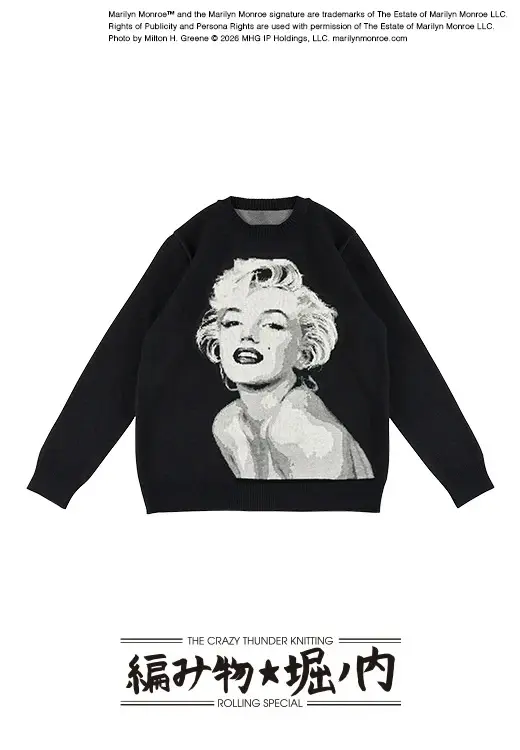 1950年代中頃に撮影されたマリリン モンローのポートレートをモチーフに、黒ベースのモノクロで表現したジャガード編みのニットセーター。