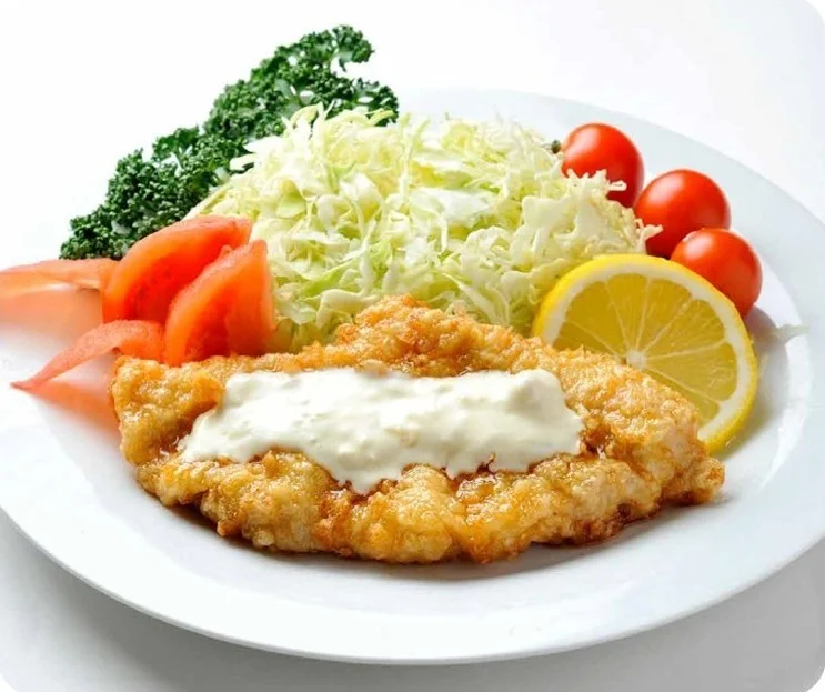 ヘルシーな鶏ムネ肉にこだわったおいしさ。ムネ肉を包む衣に、秘伝の南蛮ダレを染み込ませ、ひと口で甘酸っぱい味が口の中に広がります。玉ねぎの食感と風味を生かしたタルタルソースをたっぷりとつけて。