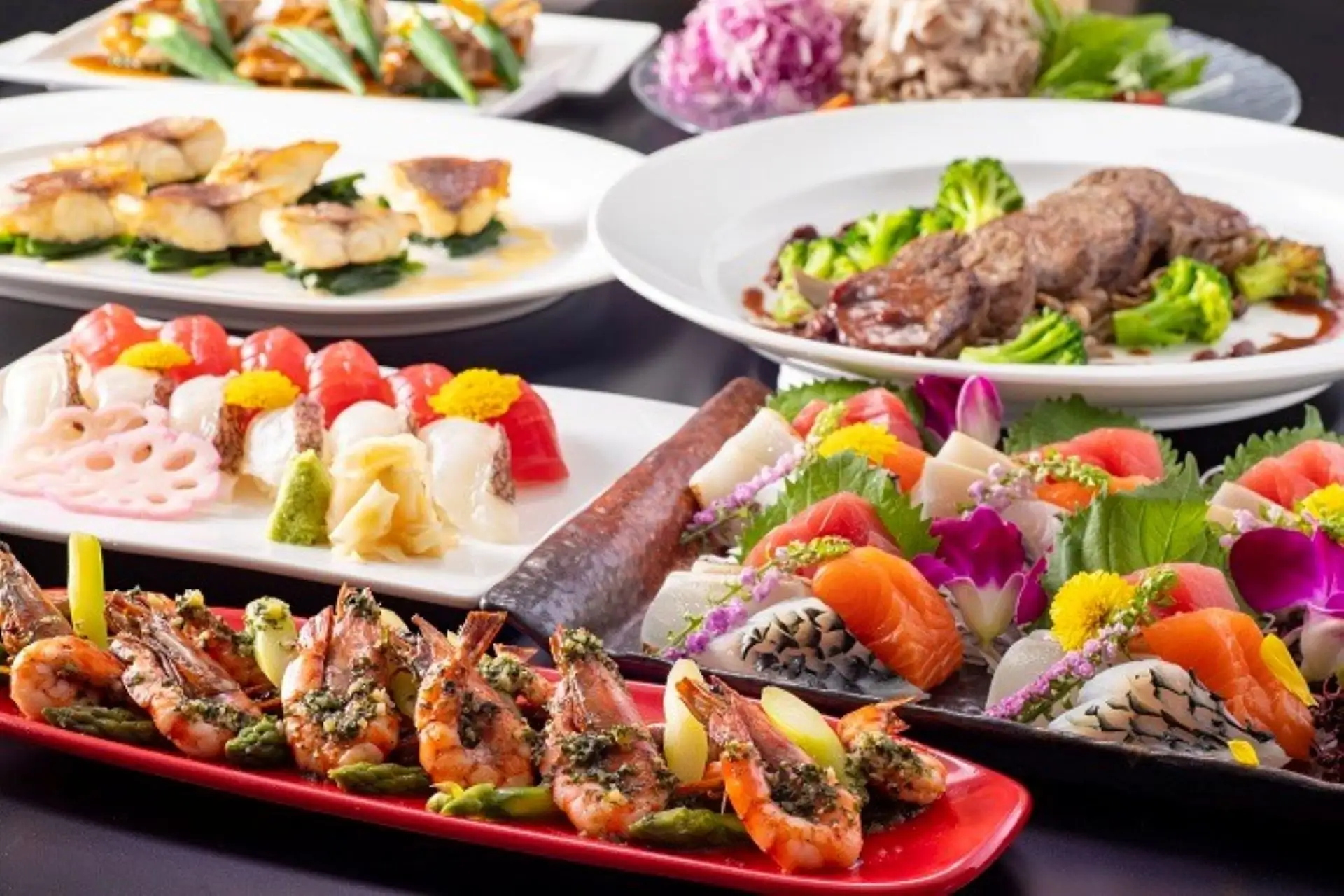 冷製:冷製ローストビーフ 山葵ソース、シュリンプとポテトのオリエンタル風、おまかせ握り寿司など