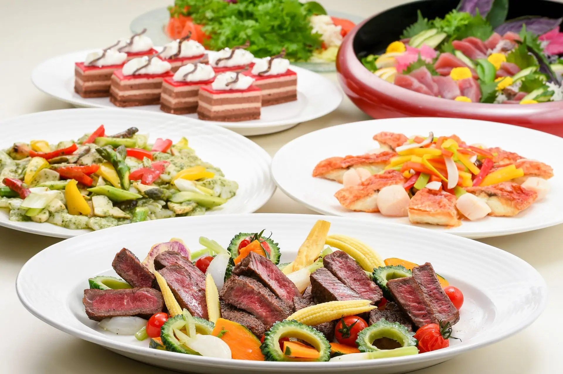 和・洋・中のブッフェスタイル(30名様より)または卓盛スタイル(15名様より) |