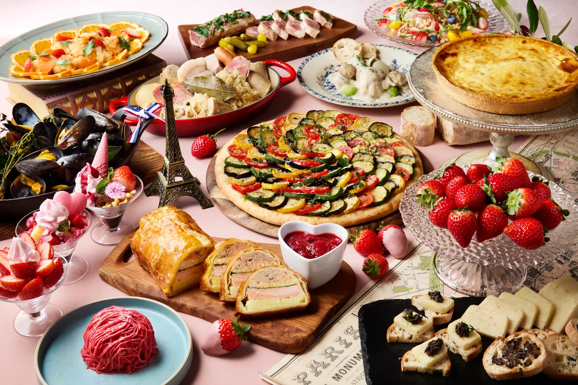 お菓子づくり体験後は、レストラン「グランサンク」にて、ホテル自慢のランチブッフェをご用意。旬のいちごと“美食のフランス”をテーマに、バラエティ豊かな料理が並びます。「白身魚のオレンジエスカベッシュ いちご添え」や、サーモン、ライス、ほうれん草をパイ生地で包み焼きにした「サーモンクリビアック」に加え、あまおういちごミルクやルビーチョコレートフォンデュ、甘酸っぱいいちごを使ったデザートも充実。実演コーナーではサーロインステーキや天婦羅、握り寿司を出来たてでご提供します。