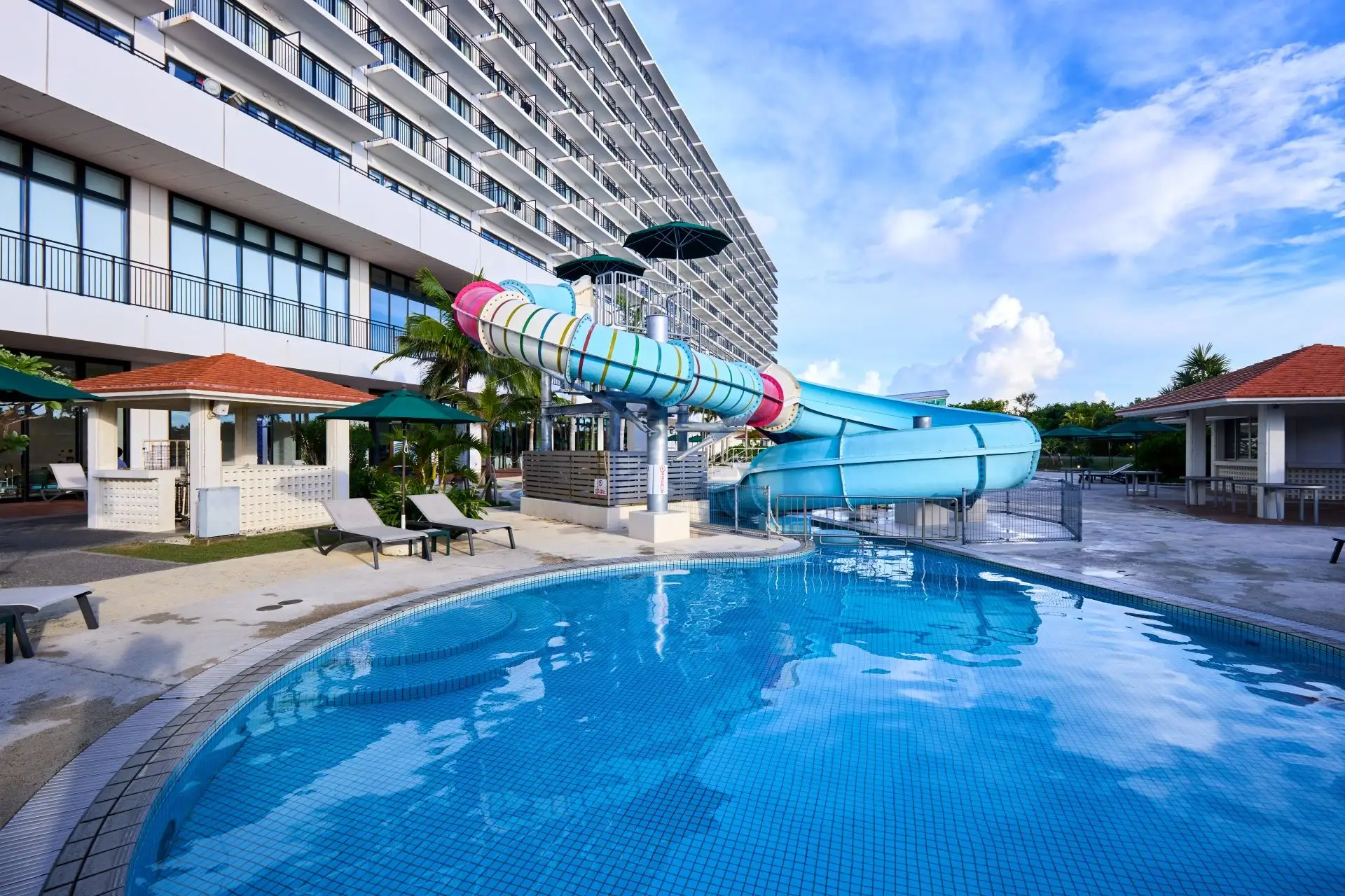 海風を感じる「ガーデンプール」と、雨天時でも安心してご利用できる「インドアプール」の両方が対象です。屋外プールには光の演出が特長のウォータースライダーも備え、大人からお子様まで一日中お楽しみいただけます。