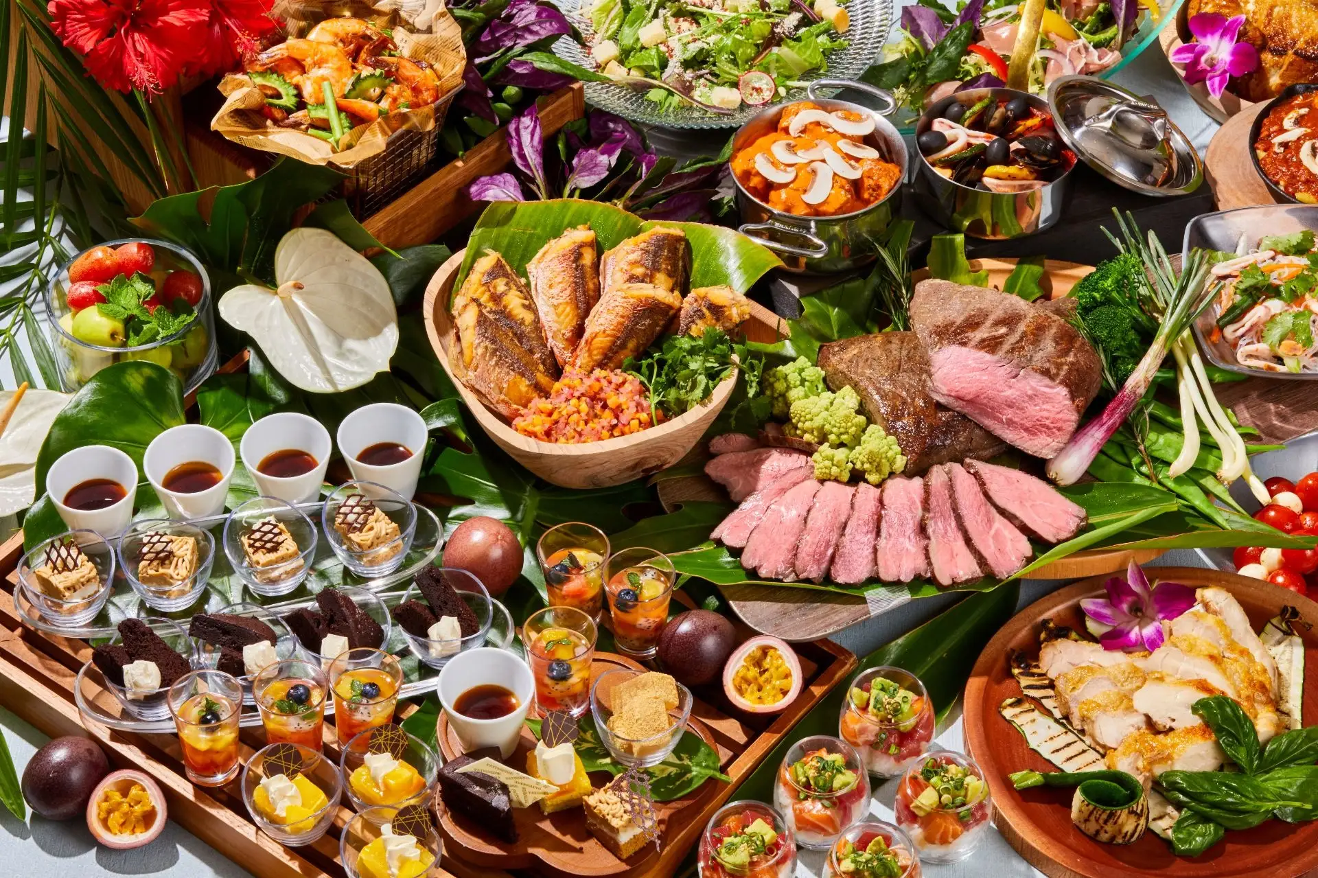 サザンビーチホテル&リゾート沖縄の2階に位置するブッフェレストラン「レイール(REIR)」。全面ガラス張りの窓の向こうには、エメラルドグリーンに輝く海が広がり、南国リゾートならではの開放感あふれる空間を演出します。沖縄近海の新鮮な食材や季節の恵みを活かした、和・洋・中のバラエティ豊かなメニューをブッフェスタイルでご提供。朝食からディナーまで、ファミリーやカップル、グループなど、さまざまなシーンに寄り添う、ホテル自慢のオールデイダイニングです。