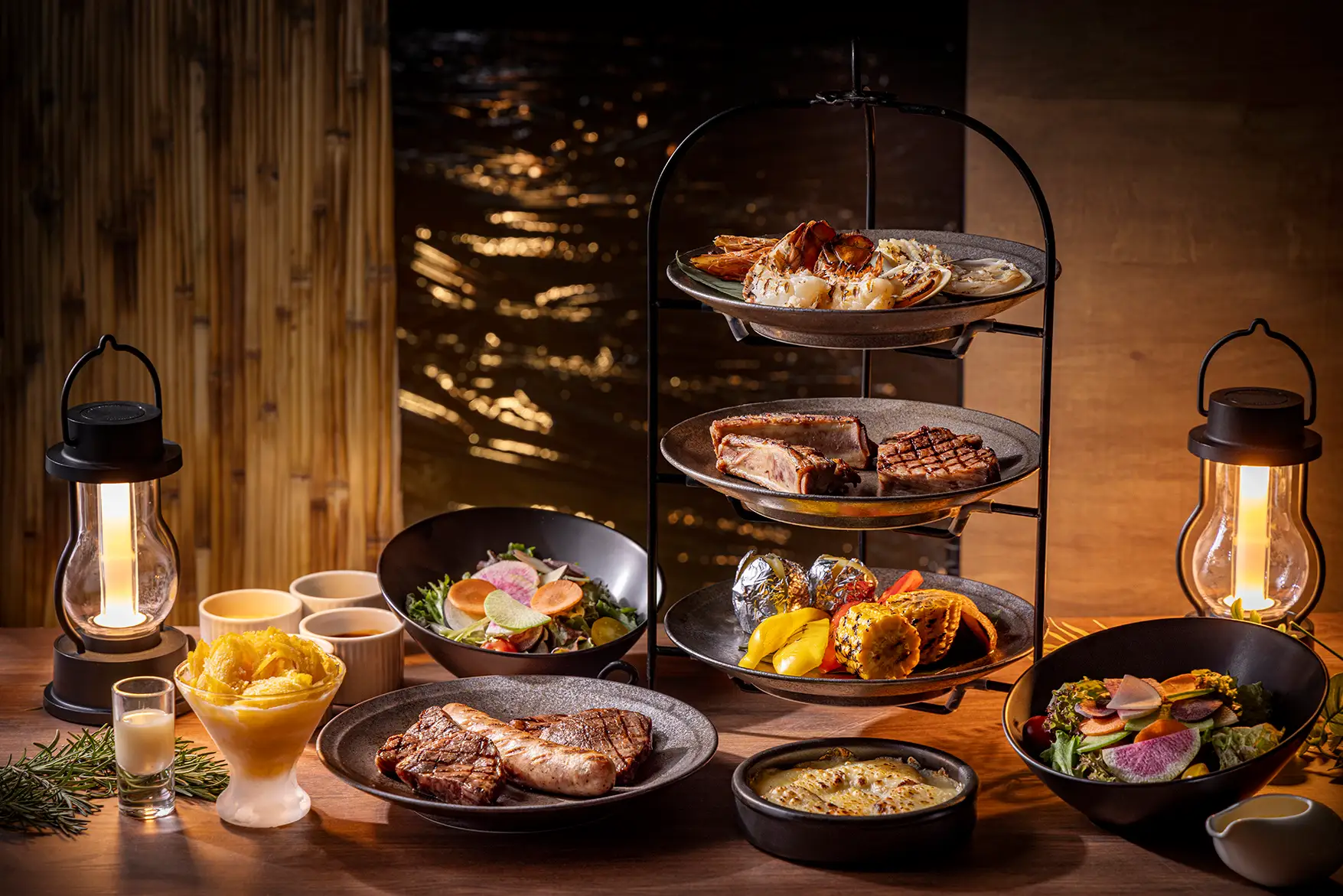 さらに、セットメニューに追加できるアラカルトも充実。凝縮された旨みと弾力を味わう「活鮑のグリル」をはじめ、「ロブスターテール」や「北海道産ホタテ貝柱」などのシーフード、「ラムチョップ」などの肉料理を取り揃え、より食べ応えのあるバーベキューをお楽しみいただけます。